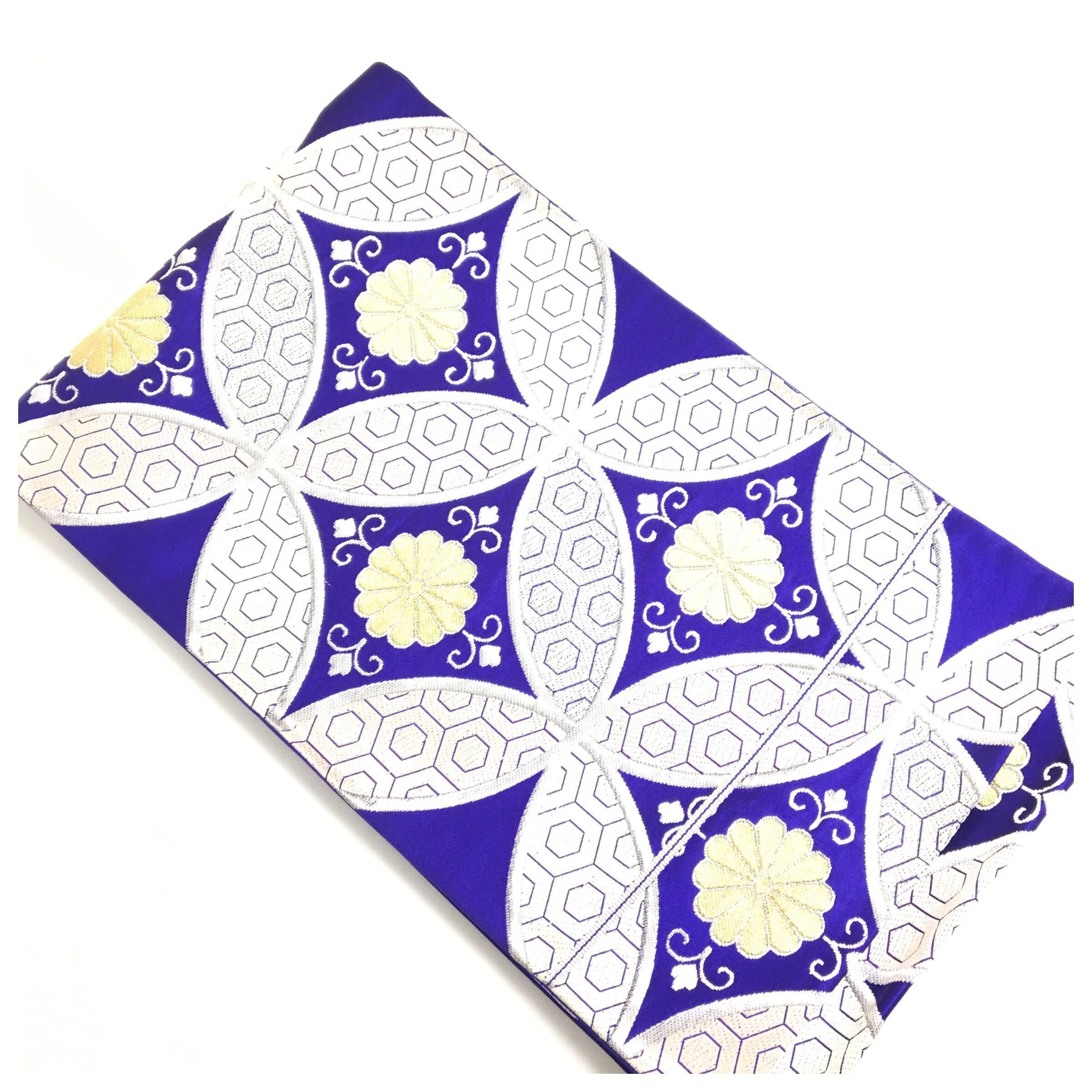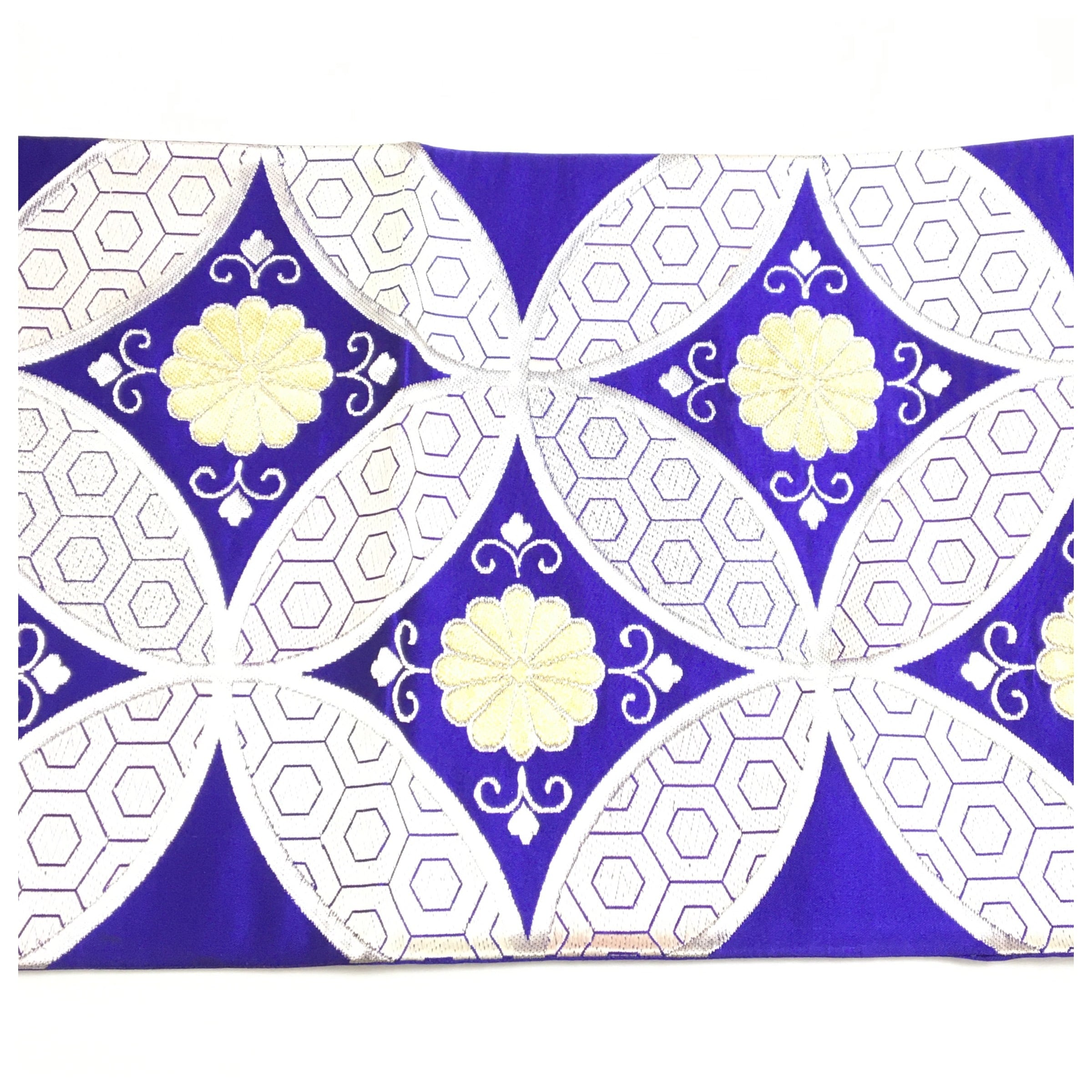 目の覚めるような鮮やかな紫の地に、「七宝文様」と「華文様」が施された、正絹のアンティーク袋帯です。