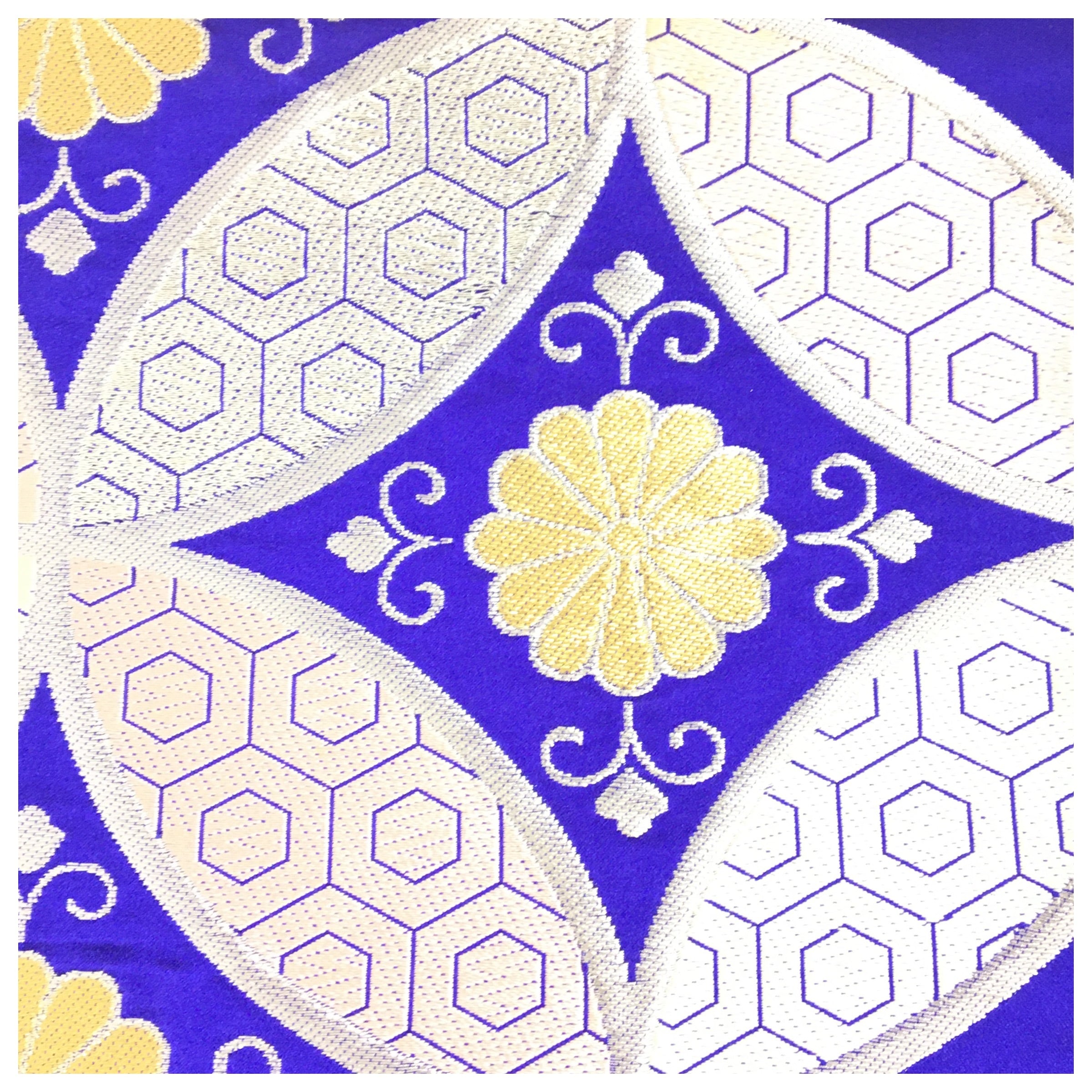 七宝の中には亀甲繋ぎが緻密に織り込まれ、中央に配置された華文様がアンティークならではのモダンさと気品を放っています。古典的な吉祥文様でありながら、大胆な配色とデザインは現代の装いにも鮮烈な印象を与えます。