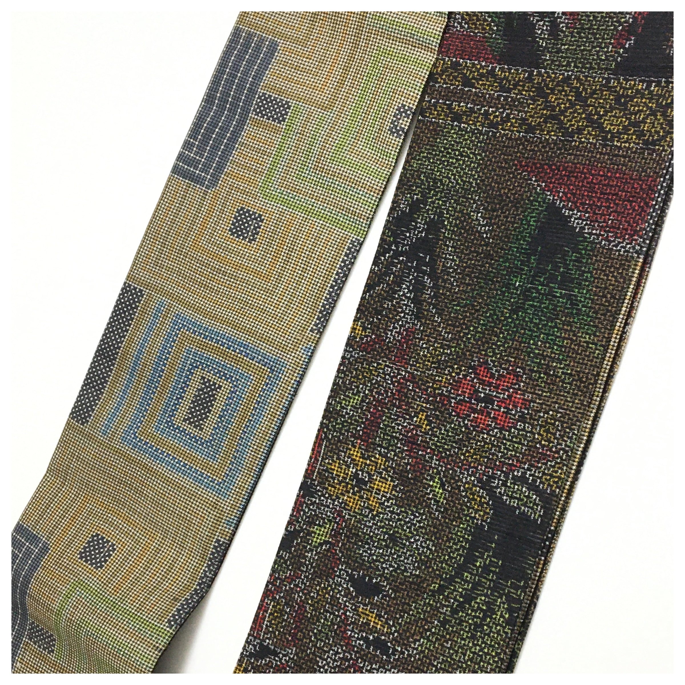 本品は創作帯のため、丁寧に継ぎを施したリメイク品ですが、着用時には隠れるよう設計されています。また、帯芯が入っておりますので、貝の口や片ばさみなどの結び目もしっかりと形作ることができ、緩みにくいのが特徴です。