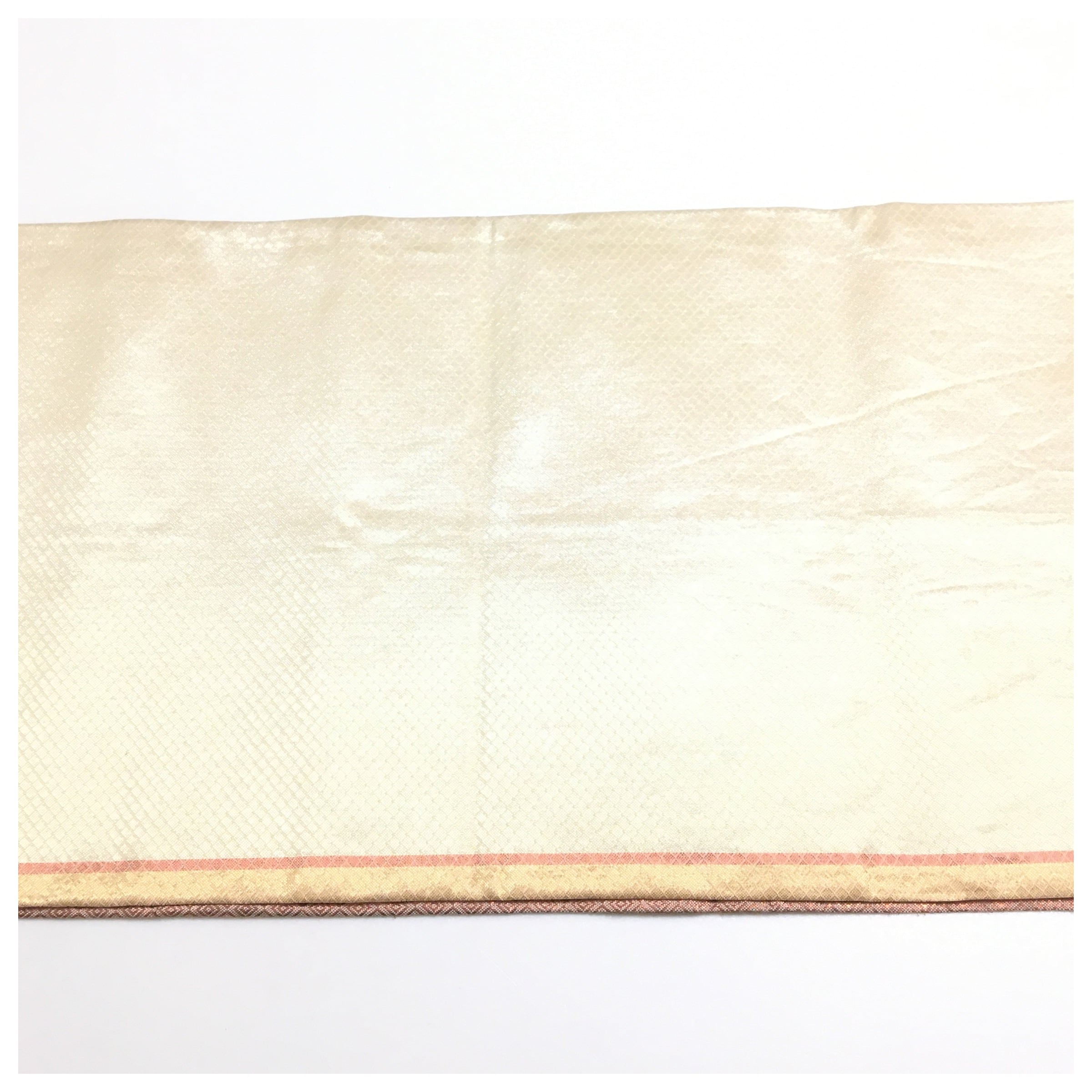 上品なベージュゴールドの地に、扇面や四季折々の草花が織り描かれた二部式の袋帯です。