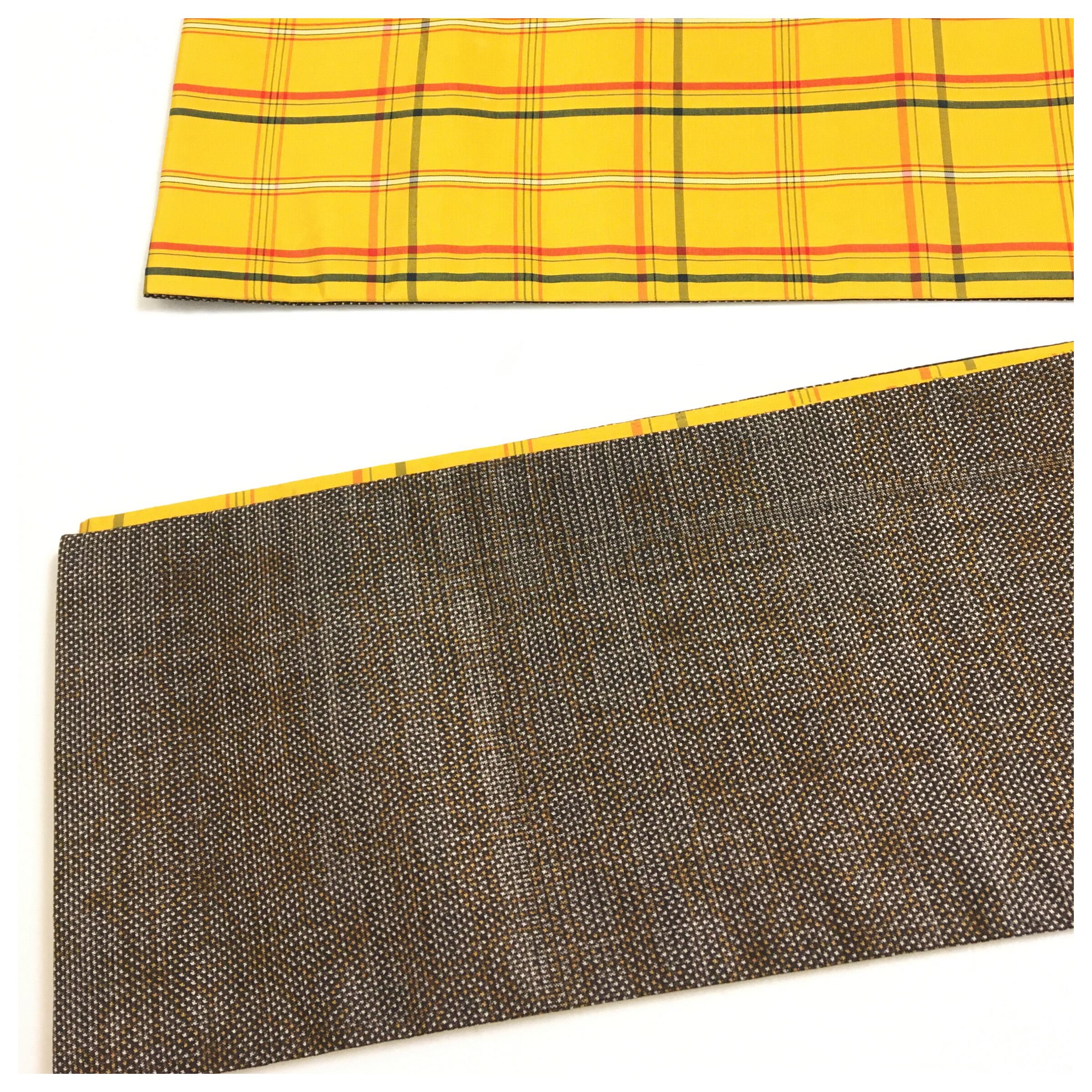 鮮やかなマスタードイエローの格子(チェック)柄と、落ち着いたブラウン系の幾何学模様を組み合わせた、リバーシブル仕様の創作半幅帯です。