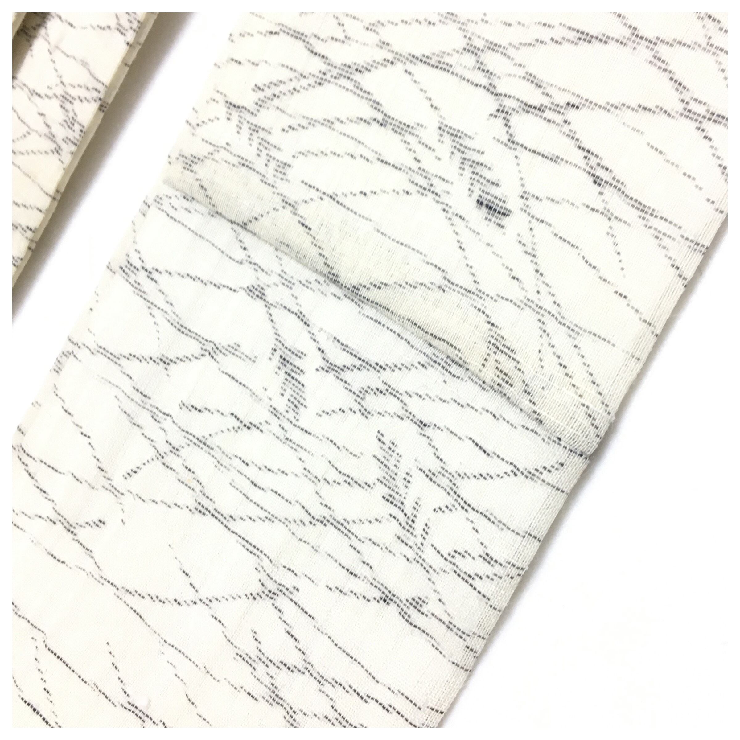 同系色の薄物や、濃紺・黒といった濃色の夏着物に合わせると、帯の白さが引き立ち清涼感のある着こなしになります。無地感の着物に合わせて、絣模様の素朴な味わいを主役にするスタイルがおすすめです。