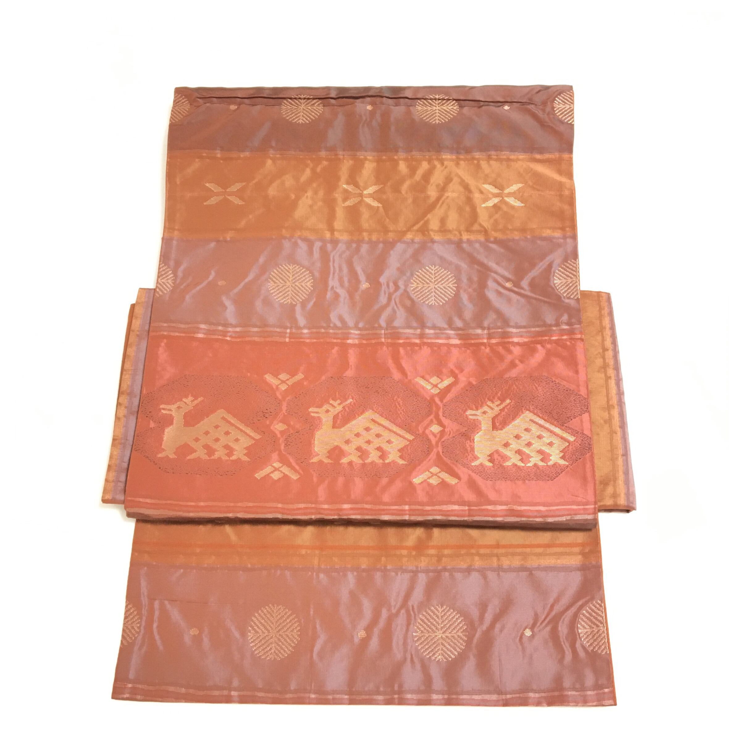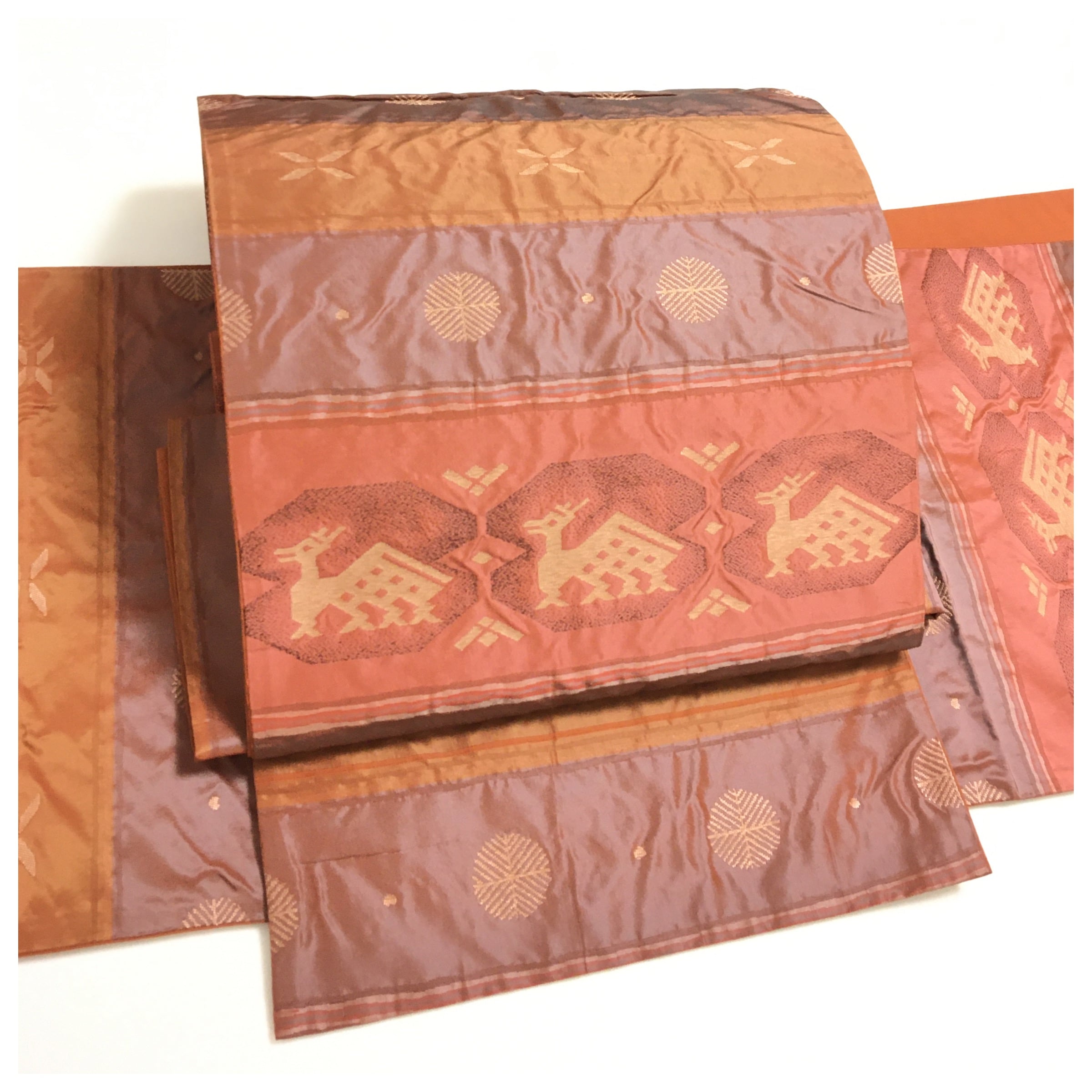 深みのある赤茶色の地に、名物裂として名高い有栖川(ありすがわ)文様が織り出された、正絹の二部式袋帯です。