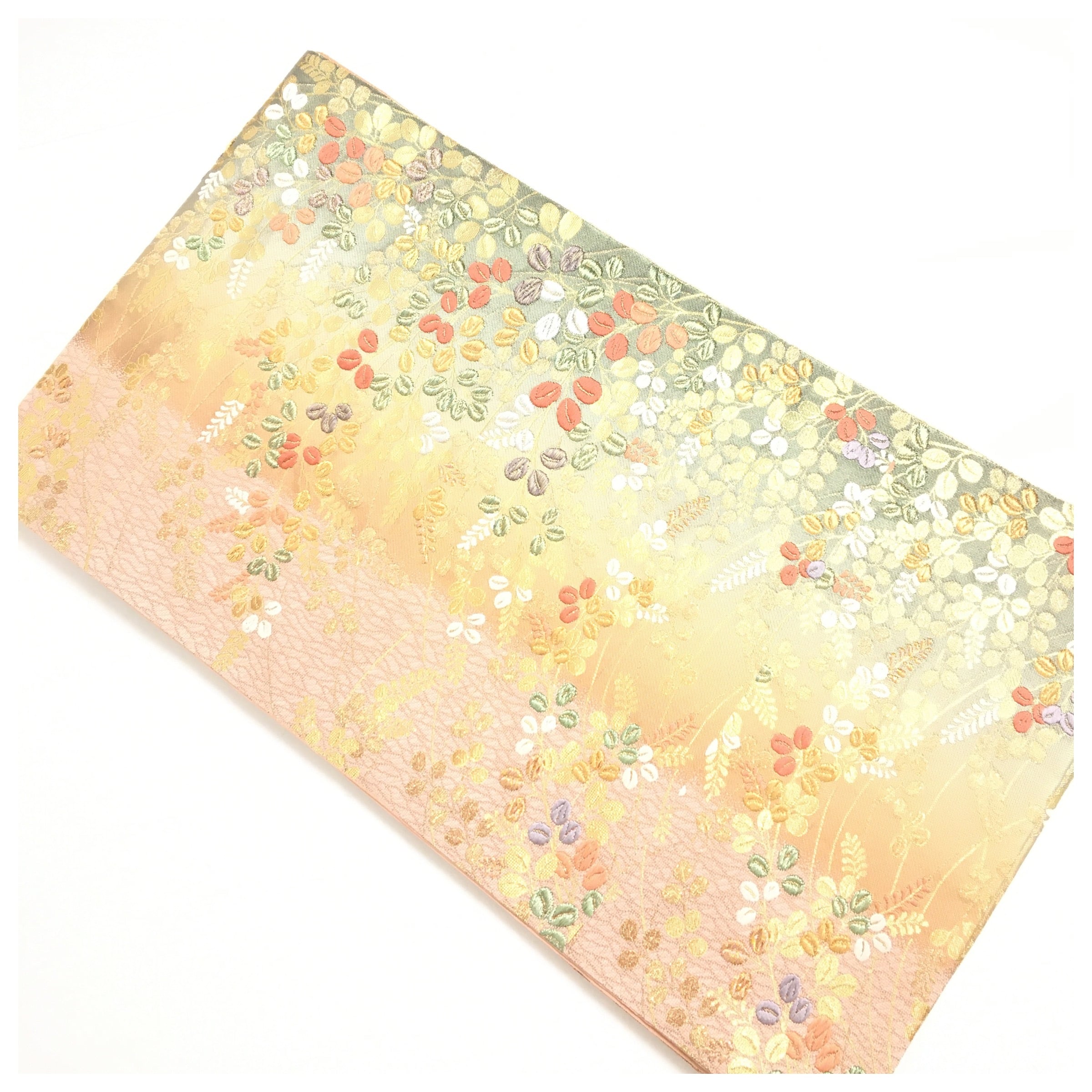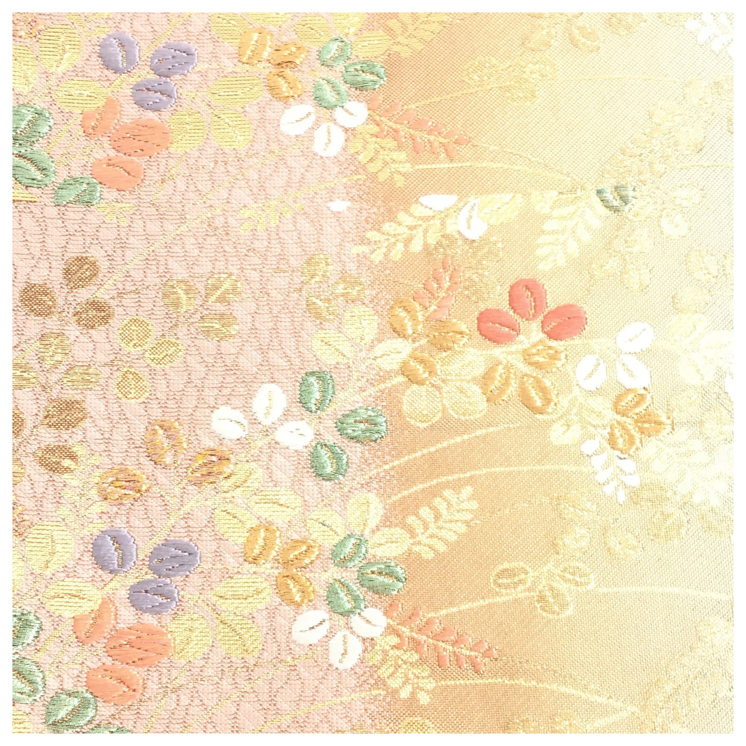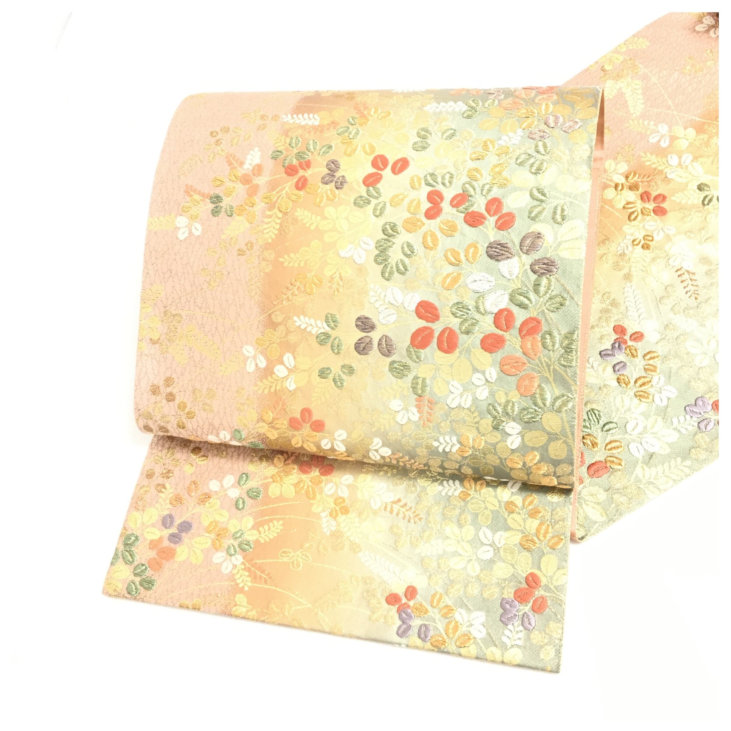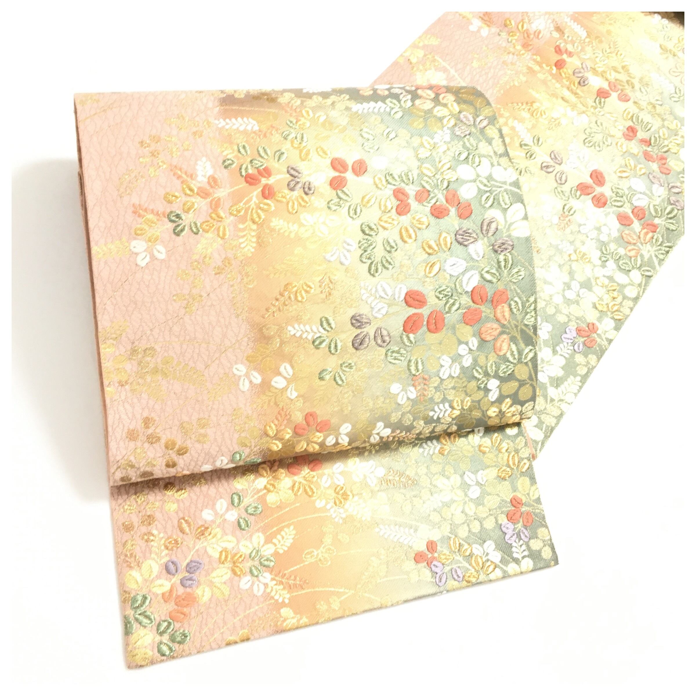 上品なピンクから柔らかなゴールド、そして清涼感のある淡いグリーンへと移ろう、美しいボカシが目を引く作り帯です。