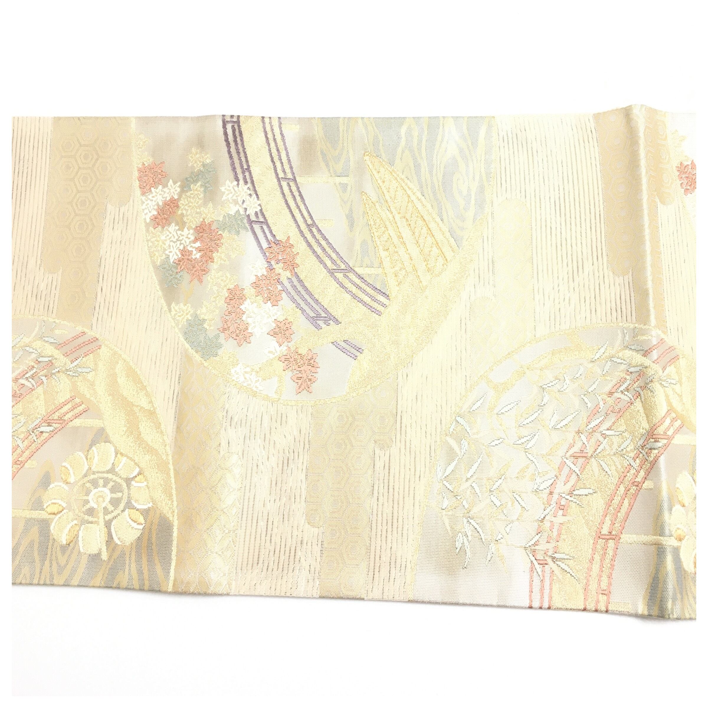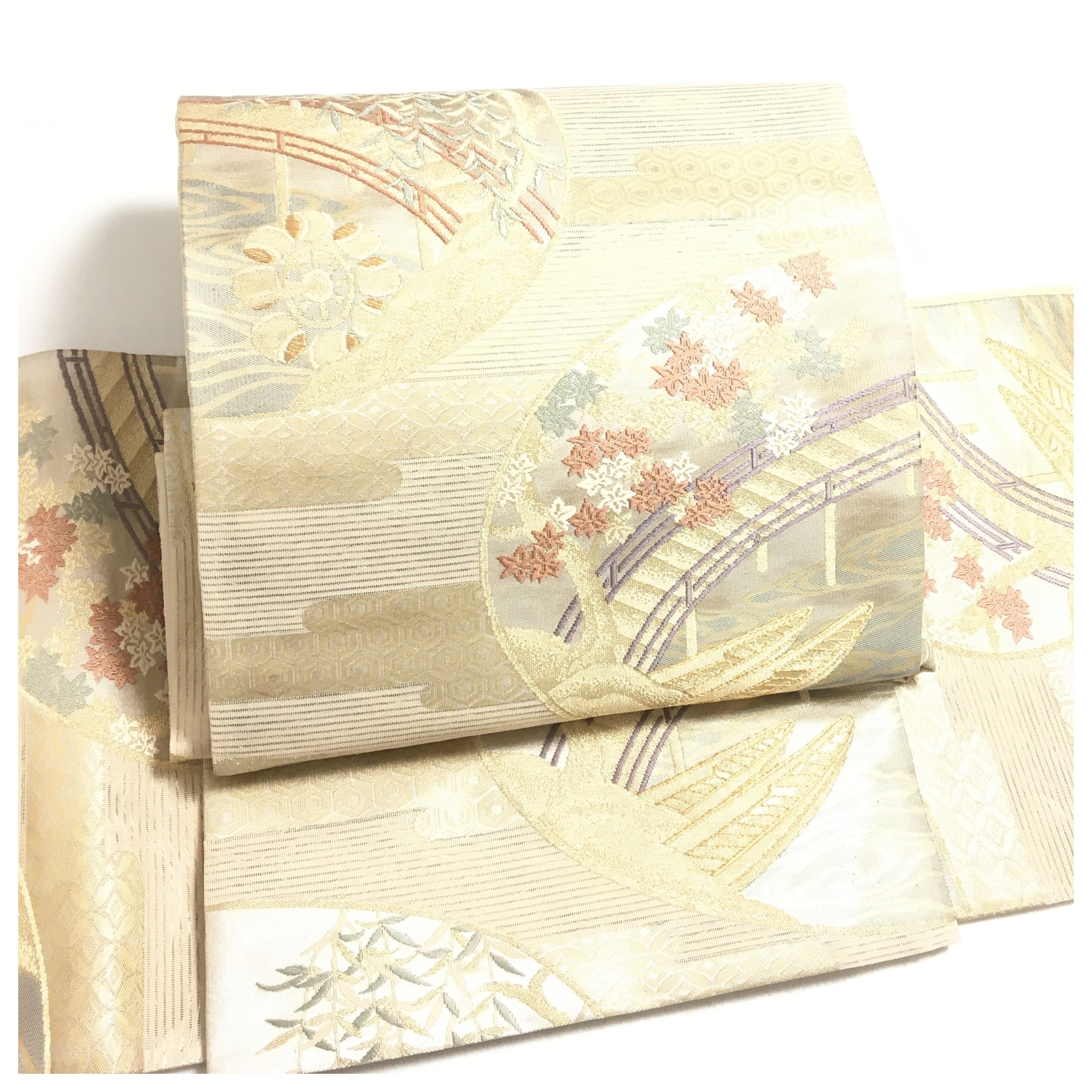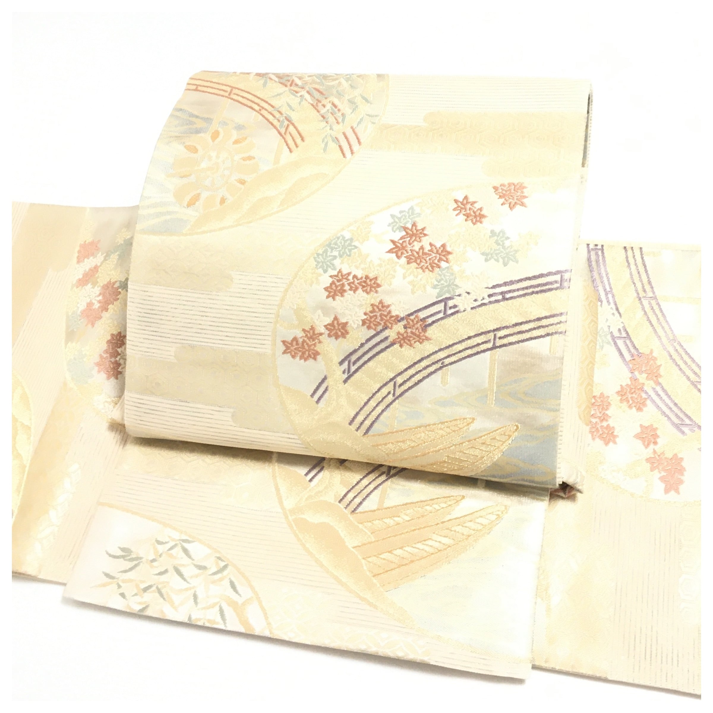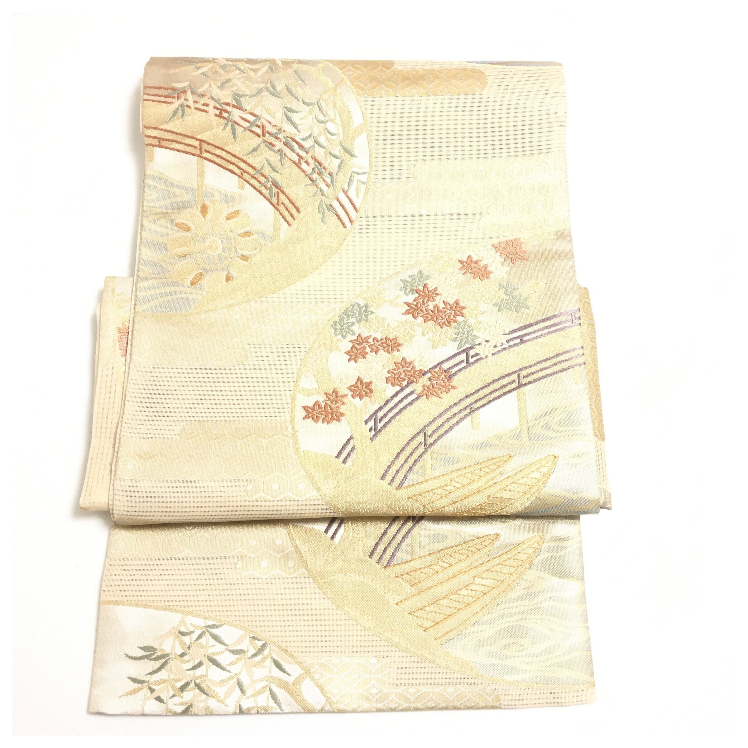 涼やかな夏の陽光に映える、正絹の夏物二部式作り帯でございます。透け感のある軽やかな地には、涼を呼ぶ流水文様を背景に、紅葉や柳といった四季の移ろいを感じさせる草花が美しく織り出されています。優雅な曲線を描く橋の意匠が奥行きを与え、格調高くも涼やかで風情あふれる表情を見せてくれます。
