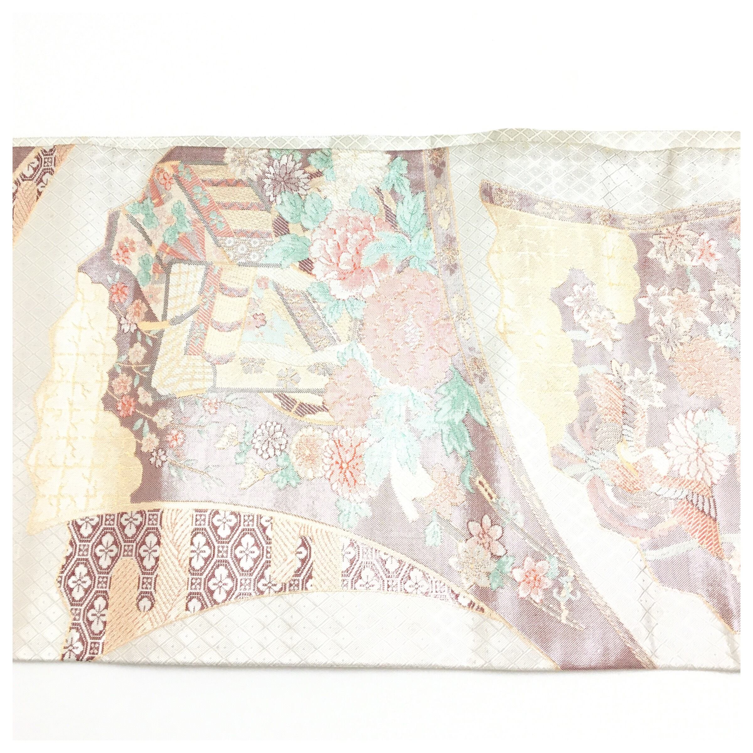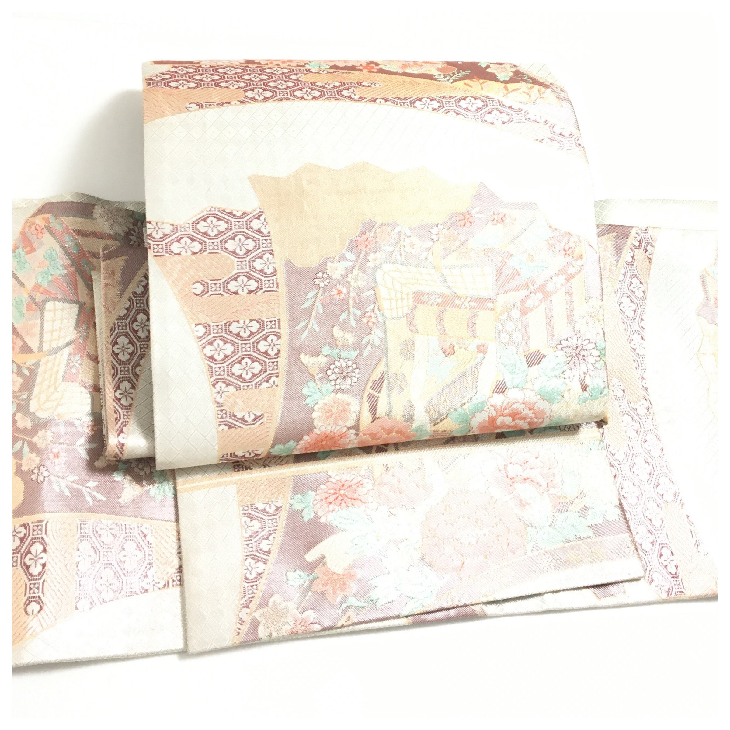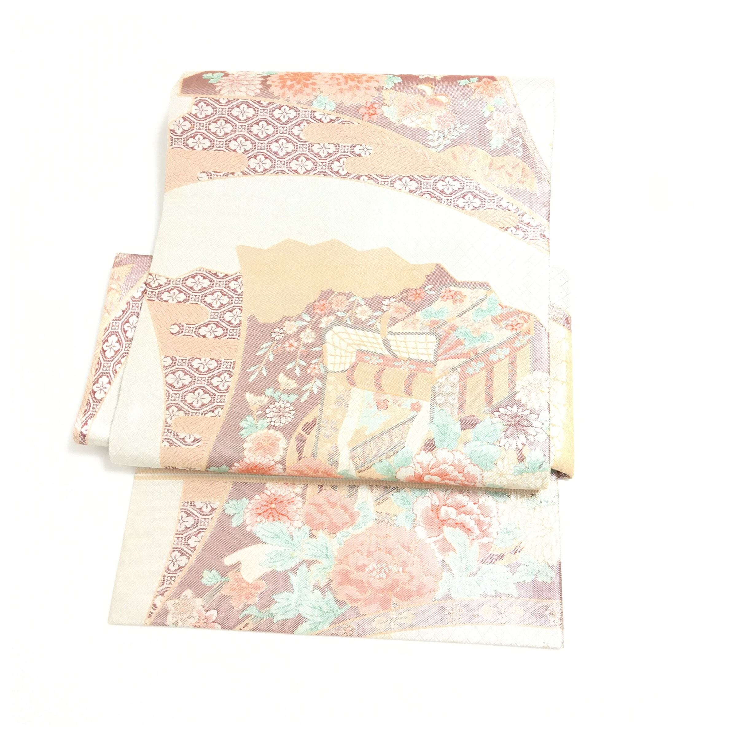 上品な輝きを放つシルバーの地に、牡丹や菊などの四季折々の花々と、御所車が描かれた古典美あふれる二部式の作り帯です。