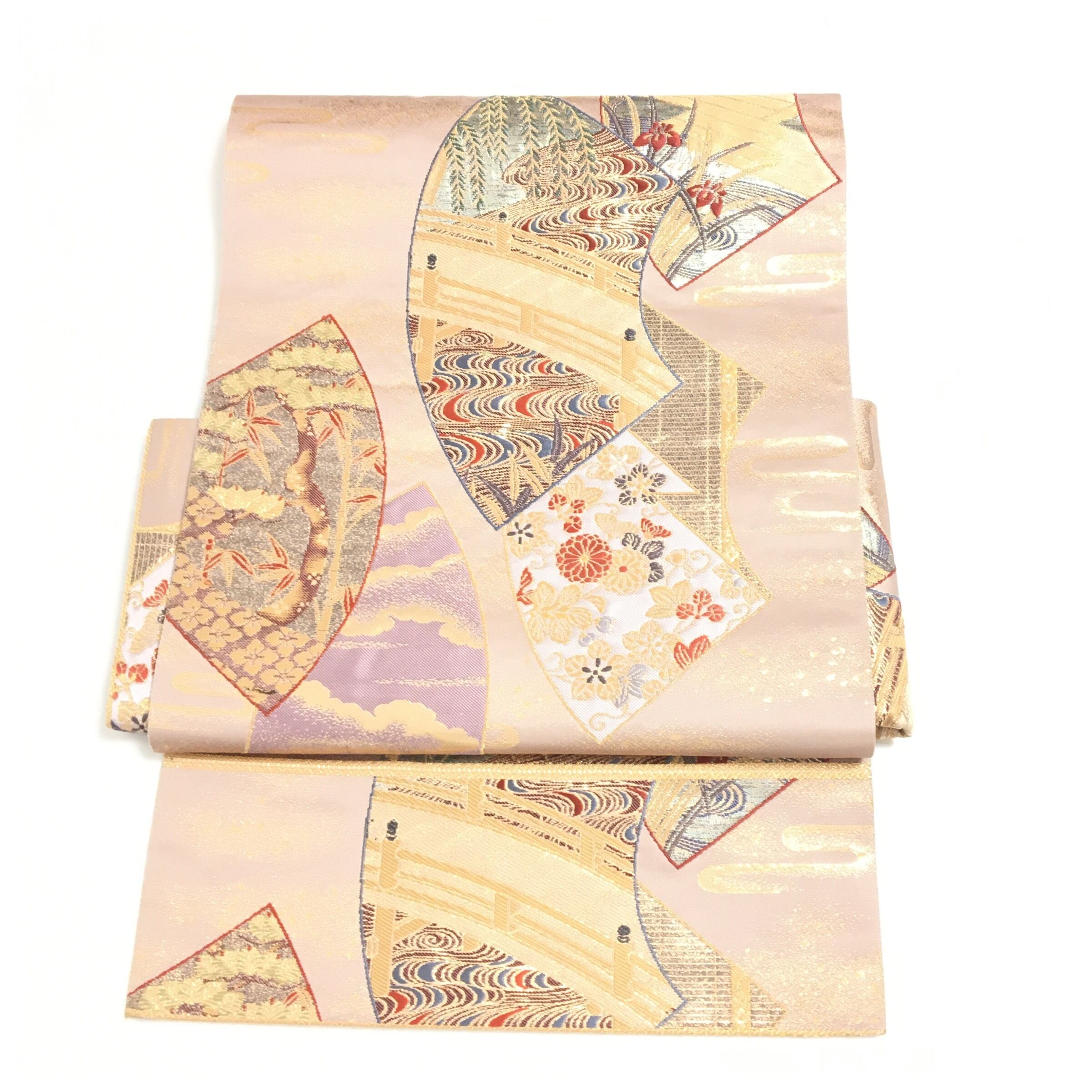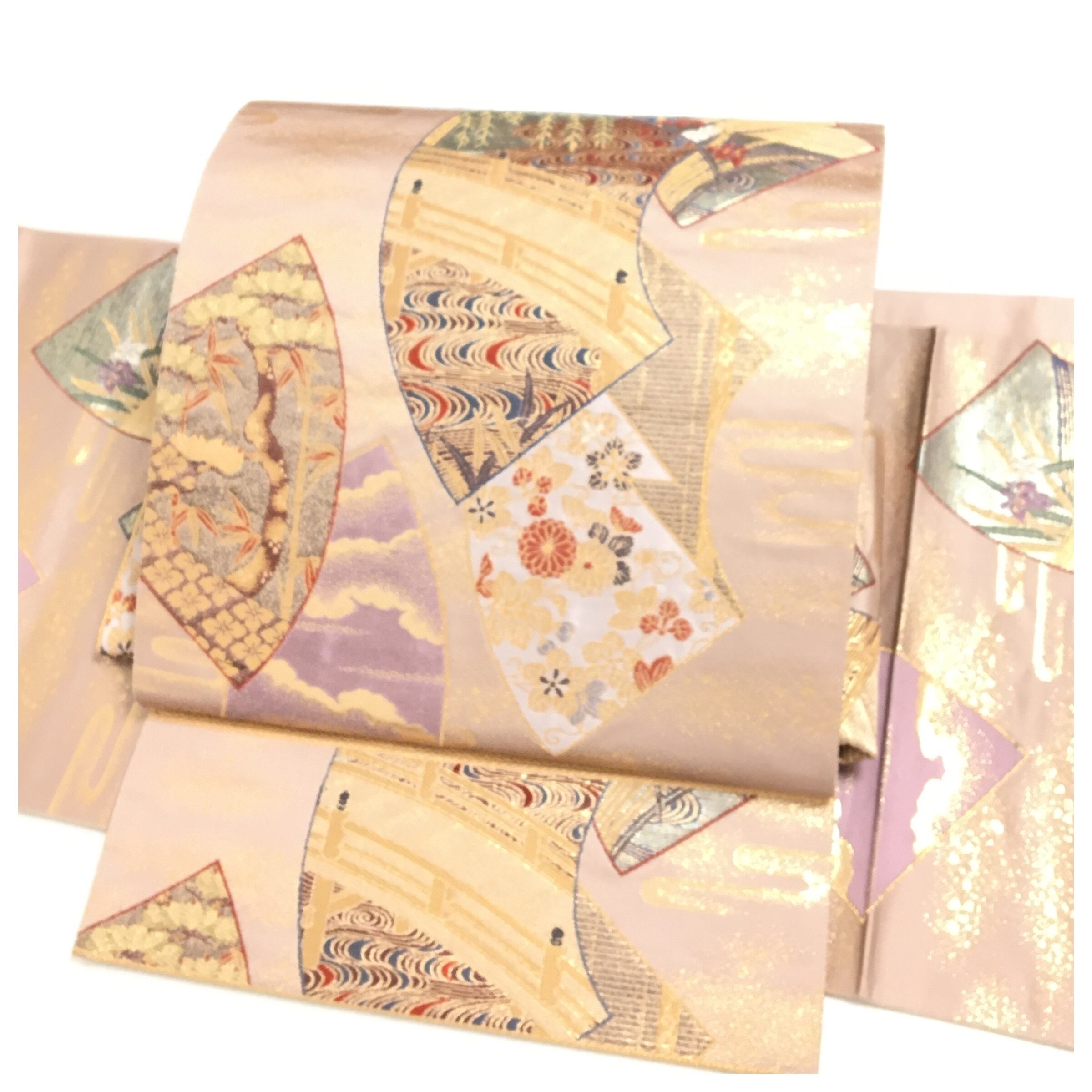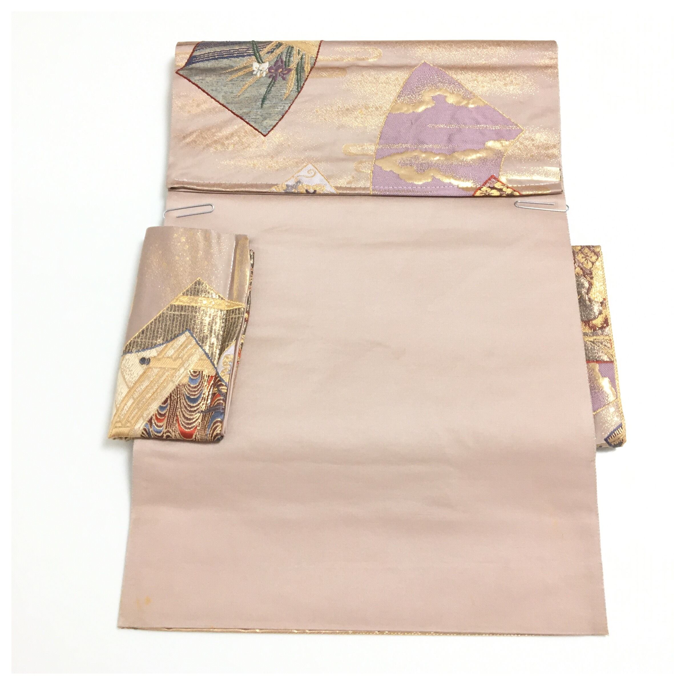 落ち着いたピンク地ですので、淡いグレーやクリーム色の訪問着に合わせて上品に、または濃色の色無地に合わせて帯の文様を際立たせる装いも素敵です。金糸が使われているため、礼装用の帯締めや帯揚げを合わせることで、より一層格調高くまとまります。