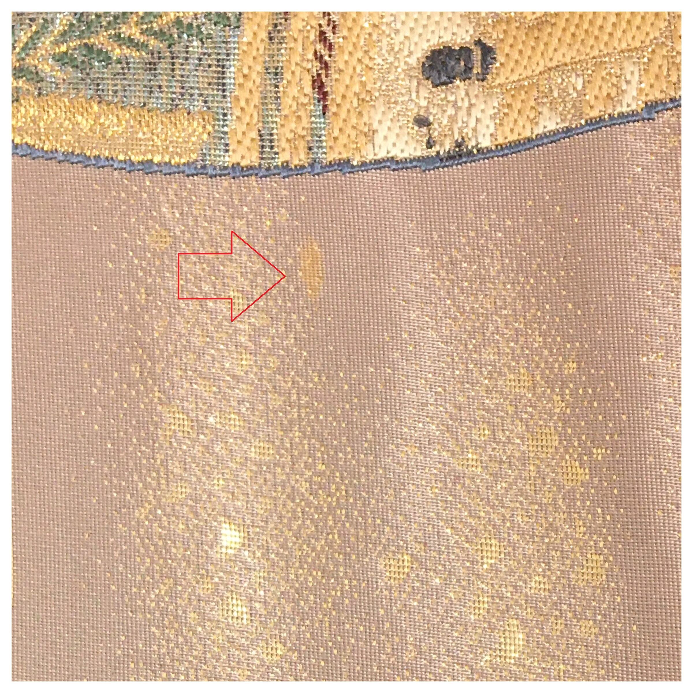 帯前の表面に、近づくとわかる程度の小さな保管シミがございます。また、帯前の裏側に汚れがございますが、着用時に表に見えることはありません。全体として着用時に目立つ汚れはなく、生地の状態も良好です。