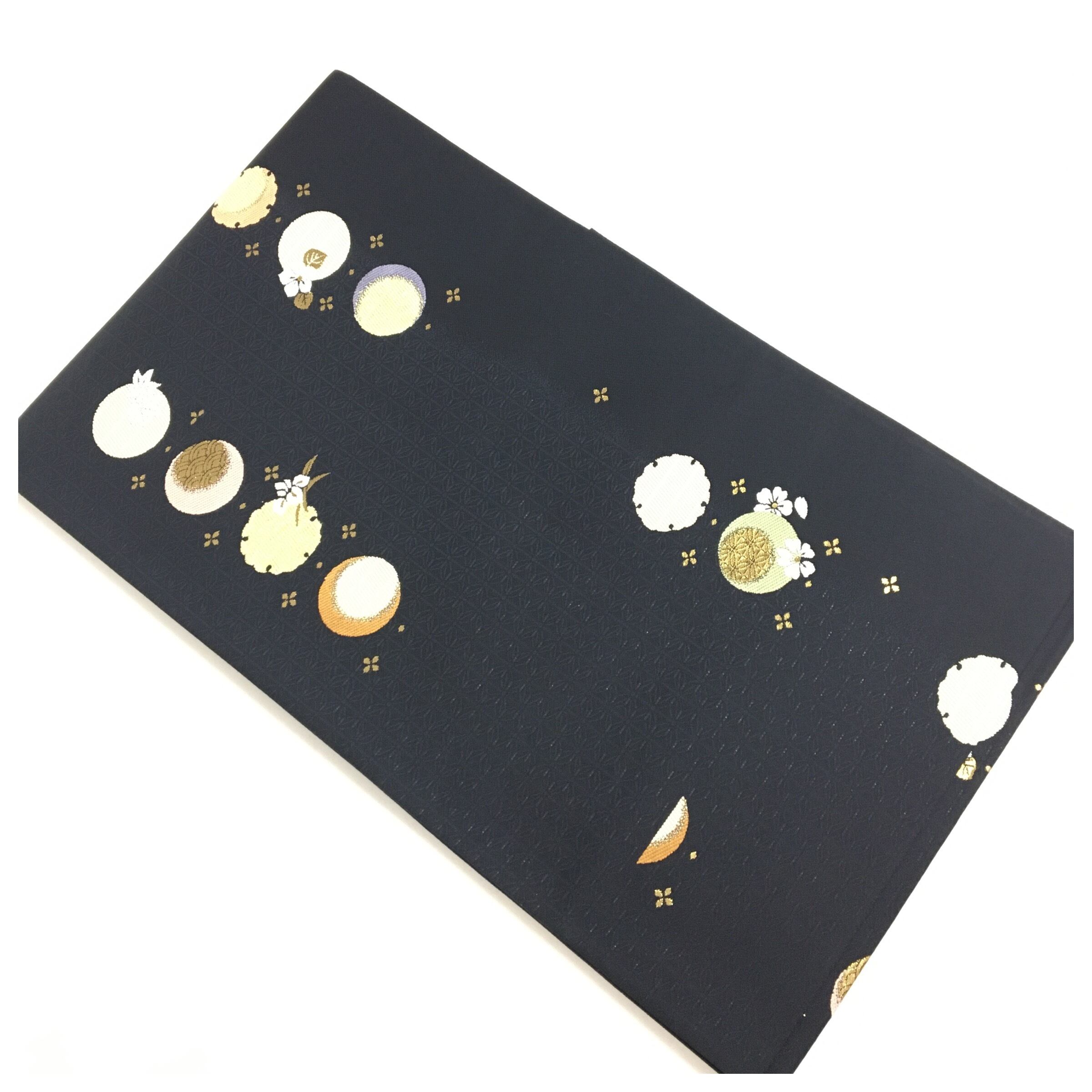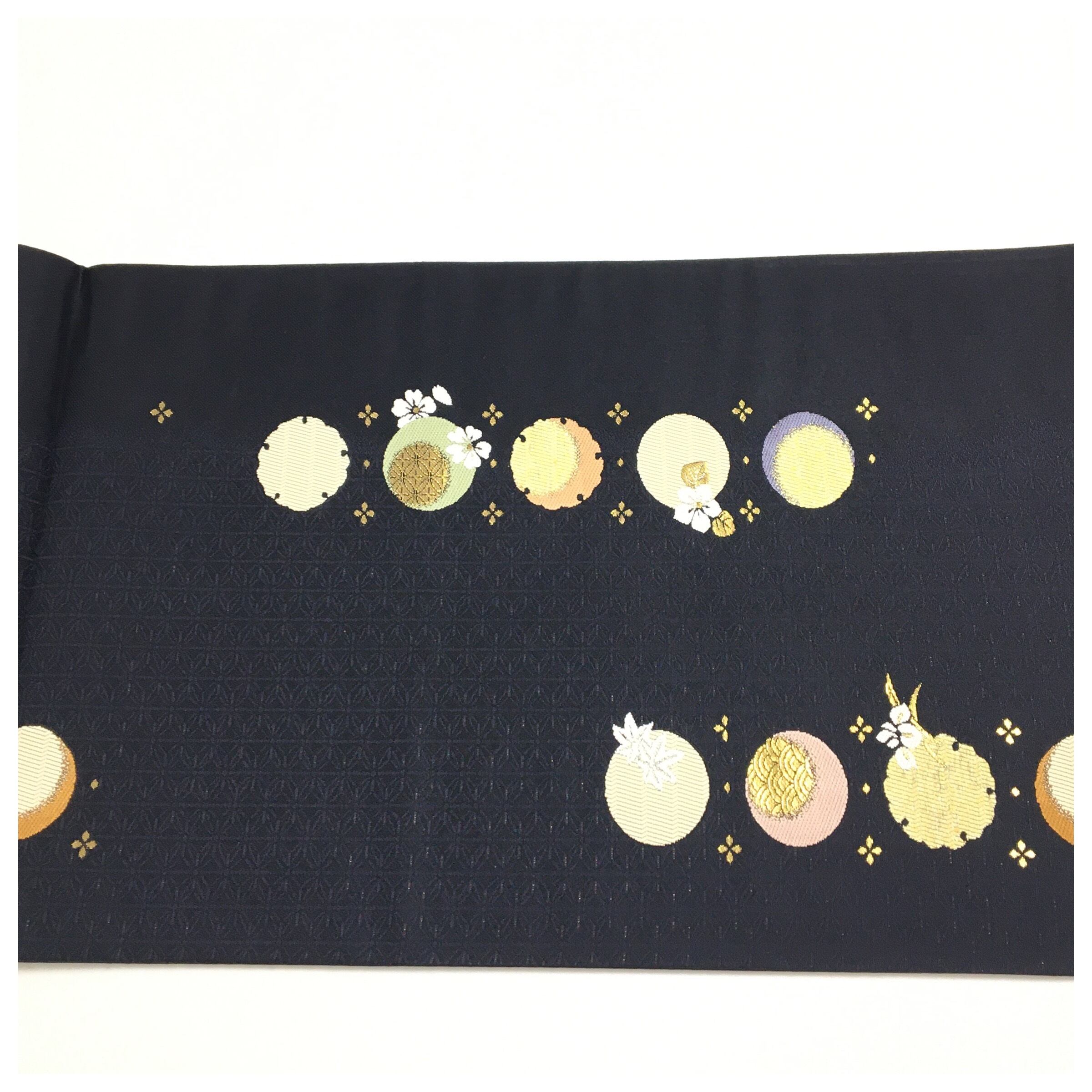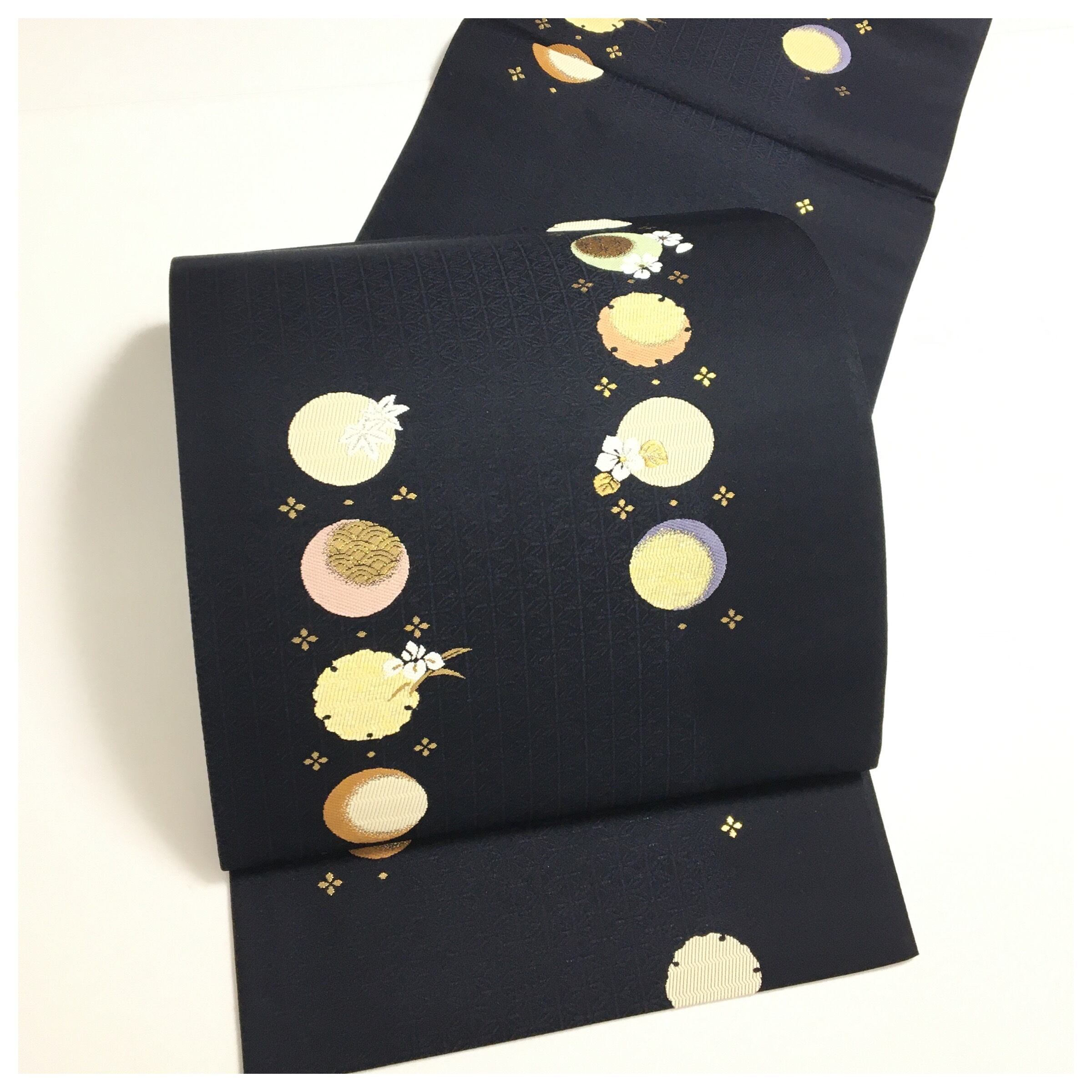 深みのある漆黒の地に、夜空に浮かぶ月のような丸紋が幻想的に配された、格調高い正絹の帯です。丸紋の中には繊細な花々や伝統的な意匠が緻密に織り込まれており、落ち着いた黒地とのコントラストが都会的で洗練された印象を与えます。