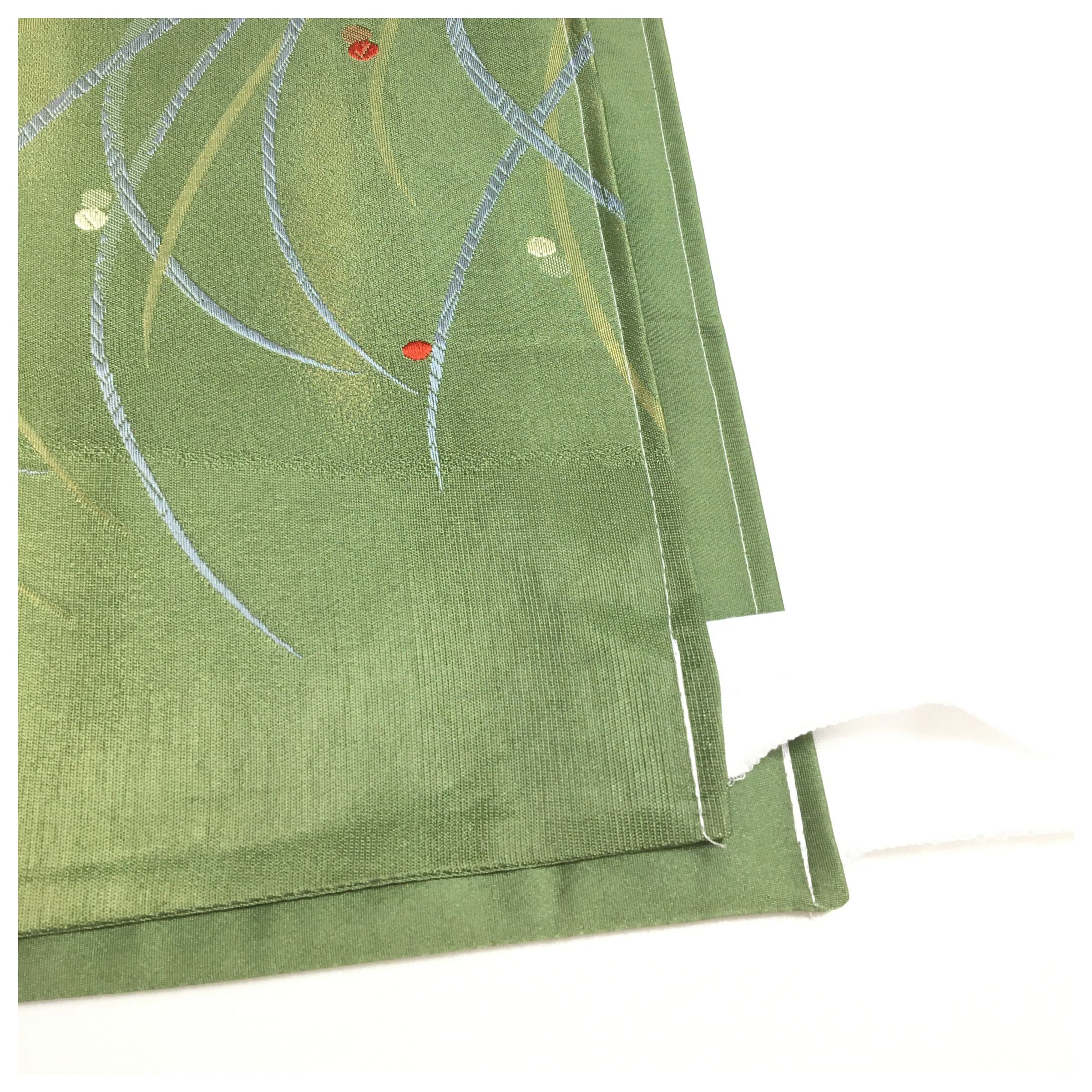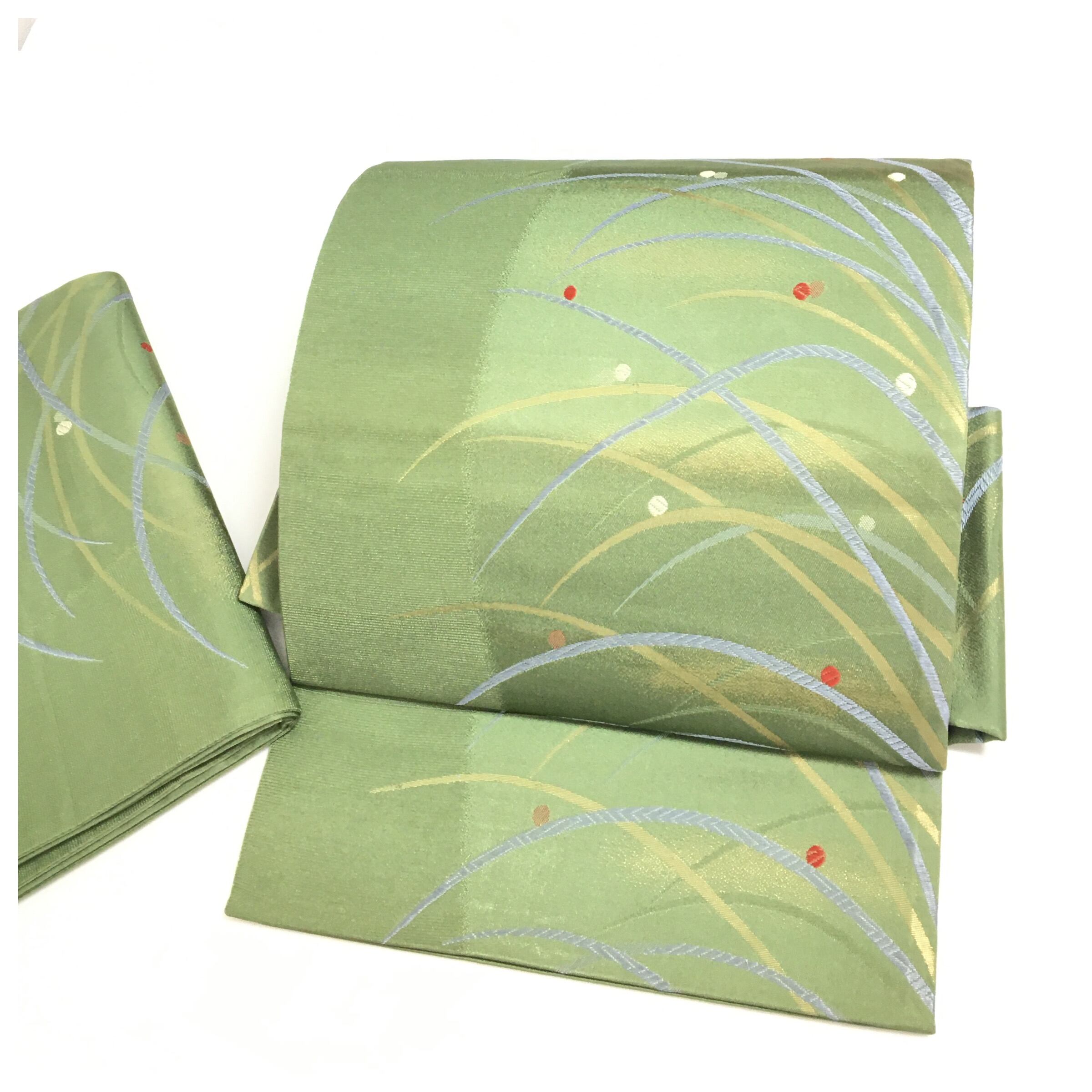 爽やかな若草色のような緑地に、風に揺れる芝草とそこに宿る瑞々しい露を表現した「芝露(しばつゆ)文様」が美しく描かれた二部式の作り帯です。流れるような曲線が装いに優雅な動きを与え、点在する赤や白の露が可憐なアクセントを添えています。