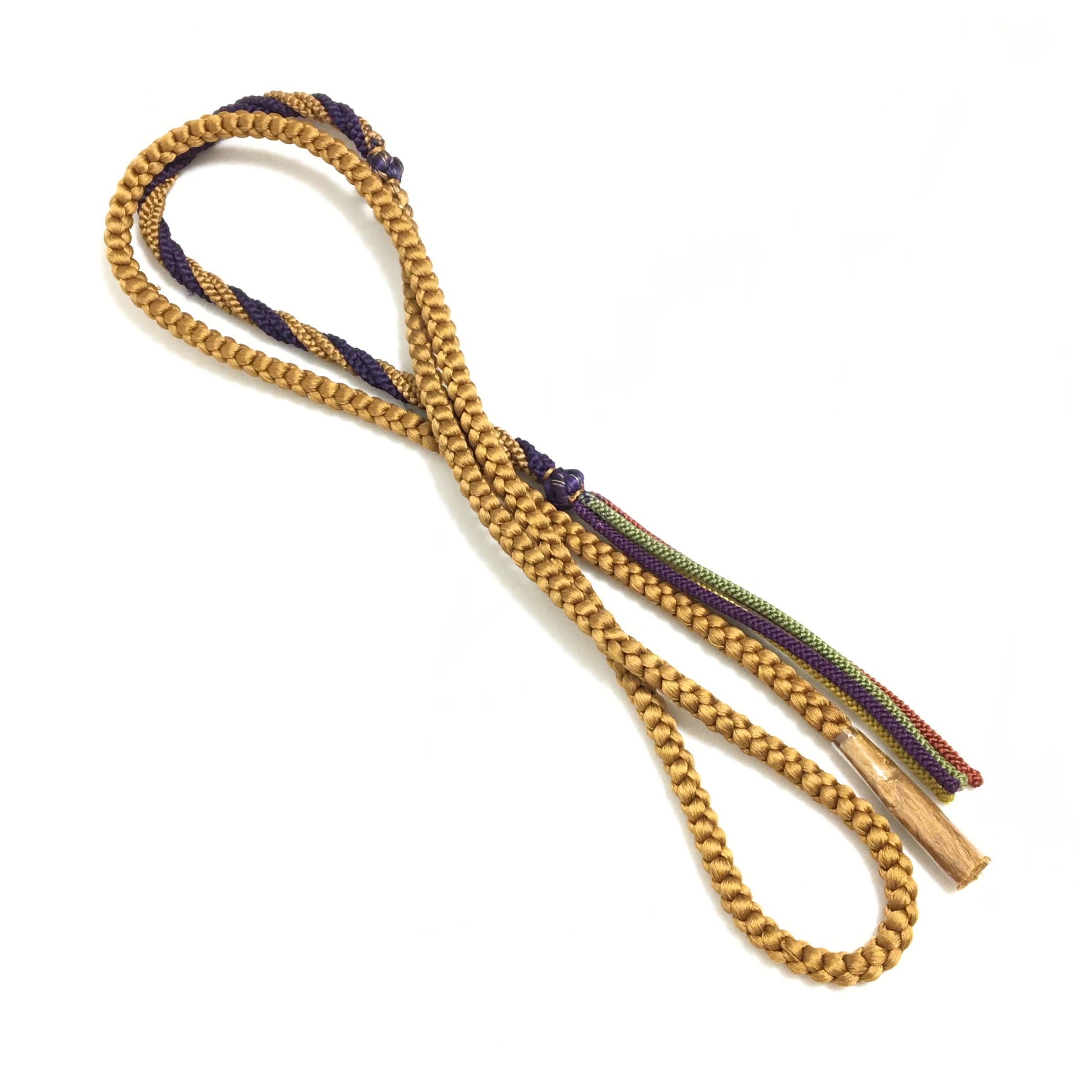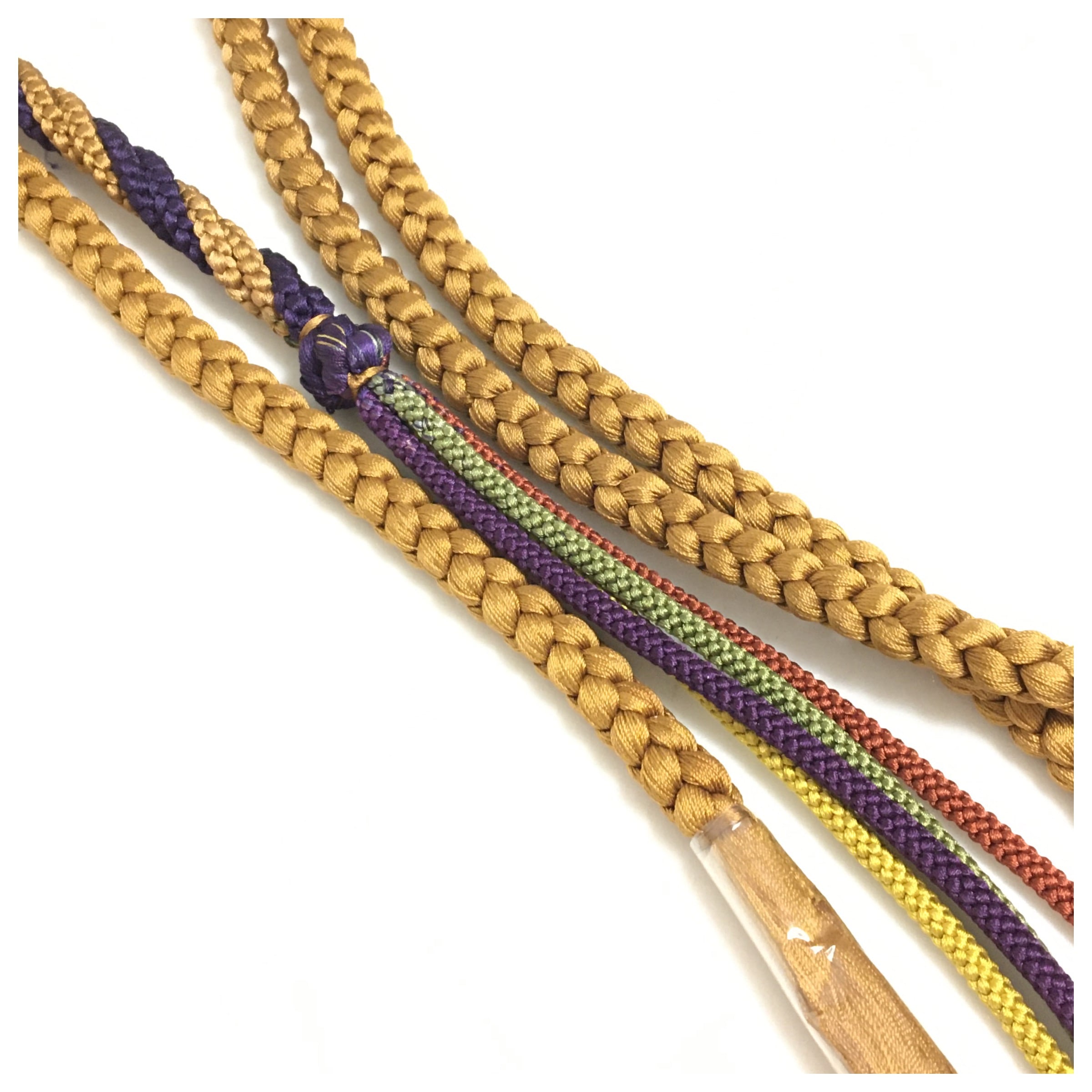 上品な黄土色を基調とし、深みのある紫の組み紐が美しく交差する丸組の帯締めです。房の手前には紫、緑、赤といった彩り豊かな細身の組み紐が添えられており、細部にまでこだわりが感じられる意匠となっております。