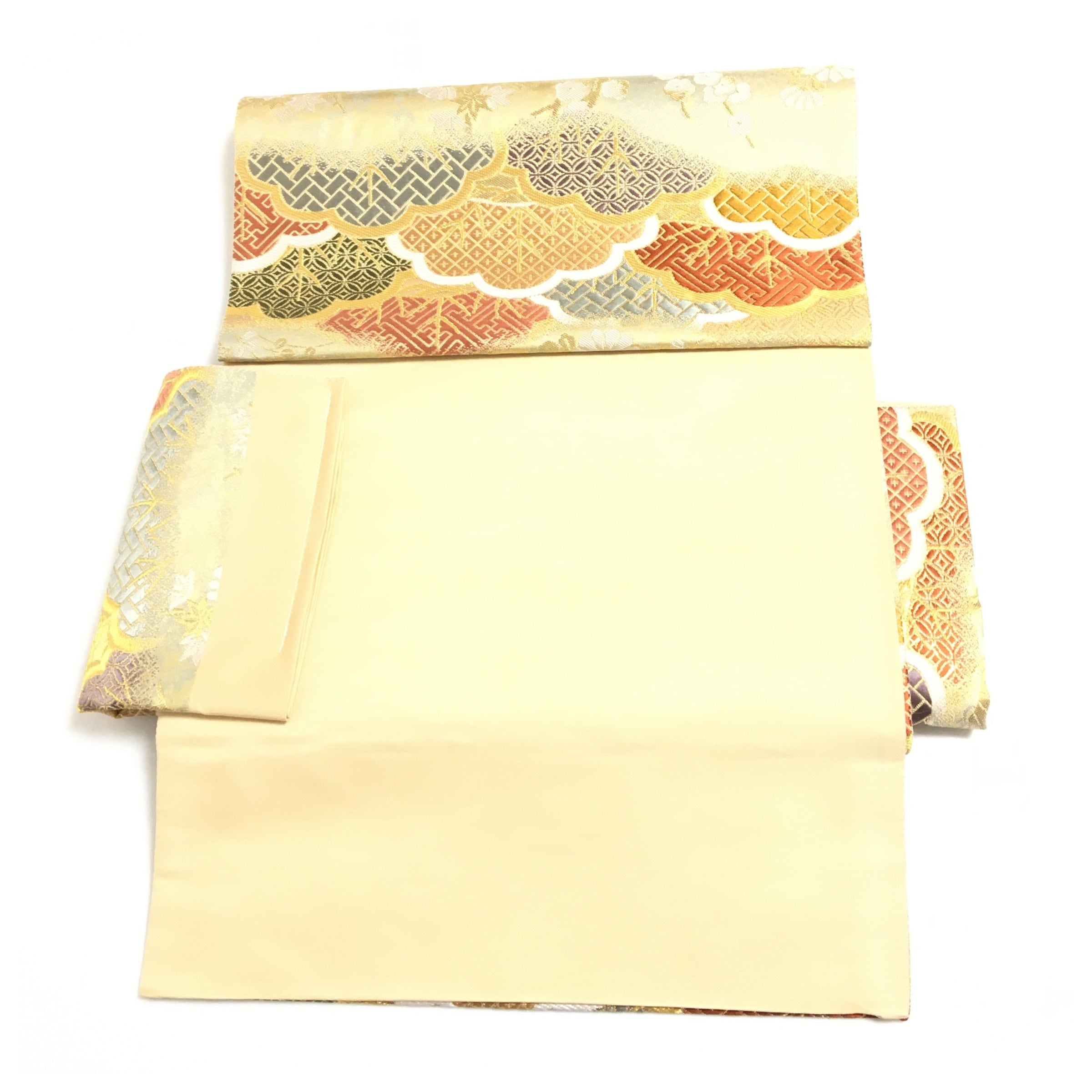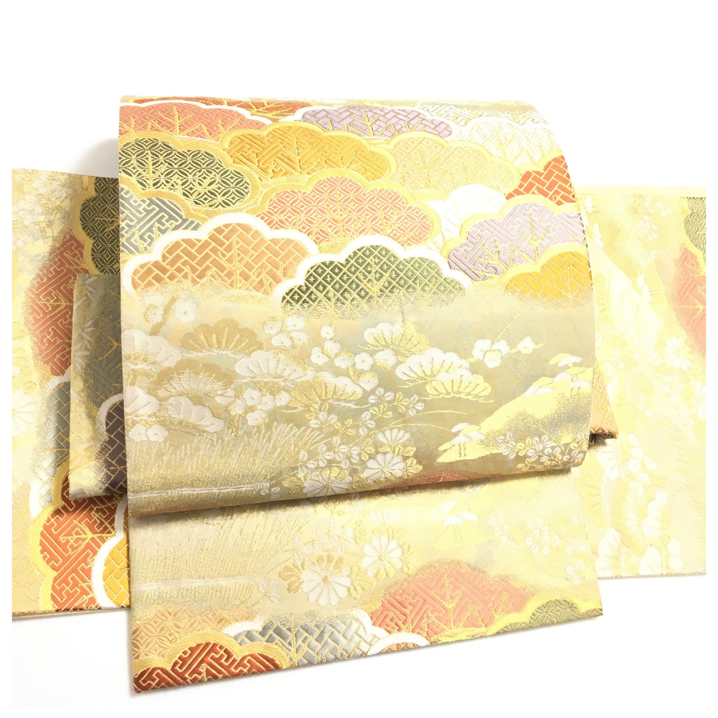 美品 正絹 作り帯 二部式 袋帯 黄金の地に瑞祥の松 雅な吉祥文様 二重太鼓