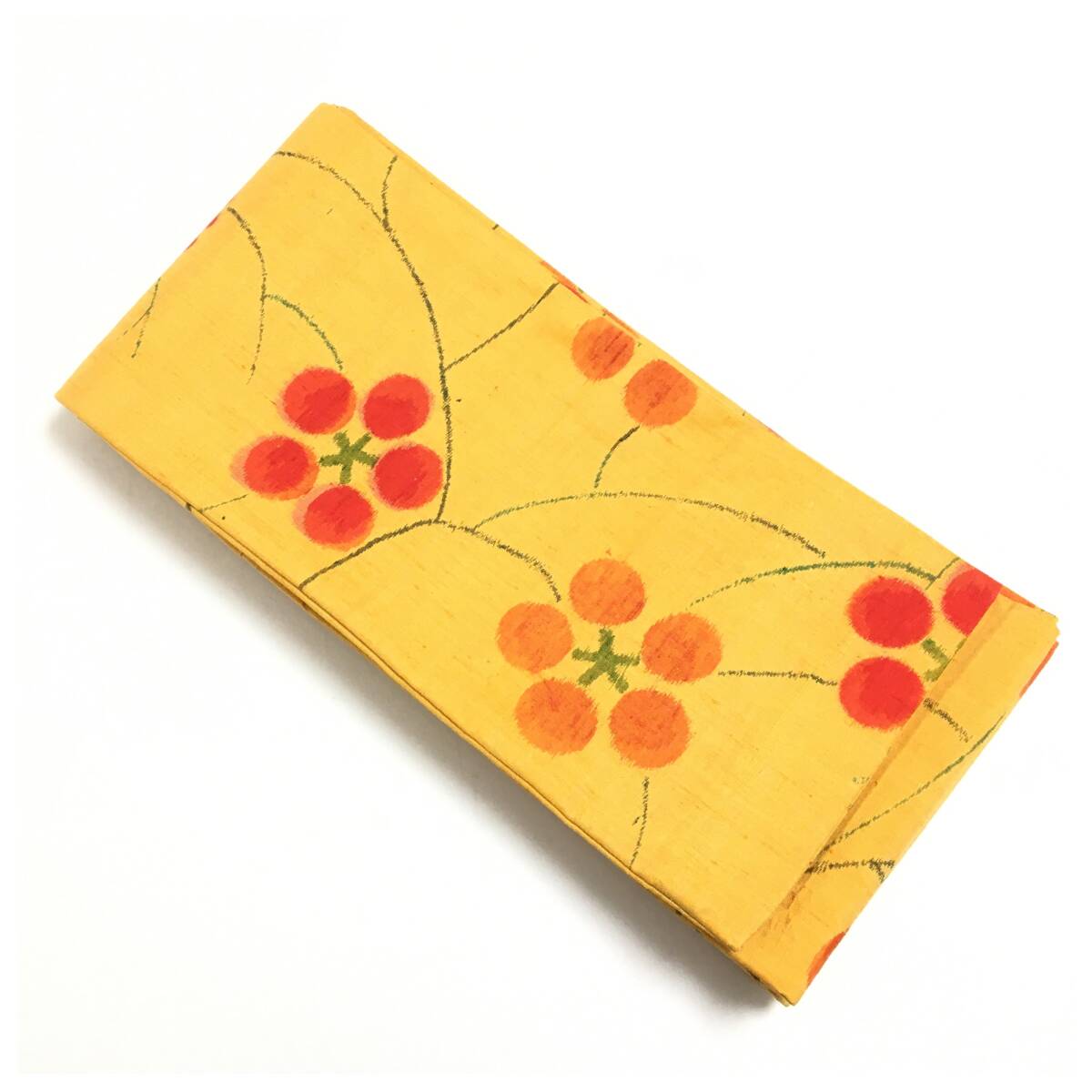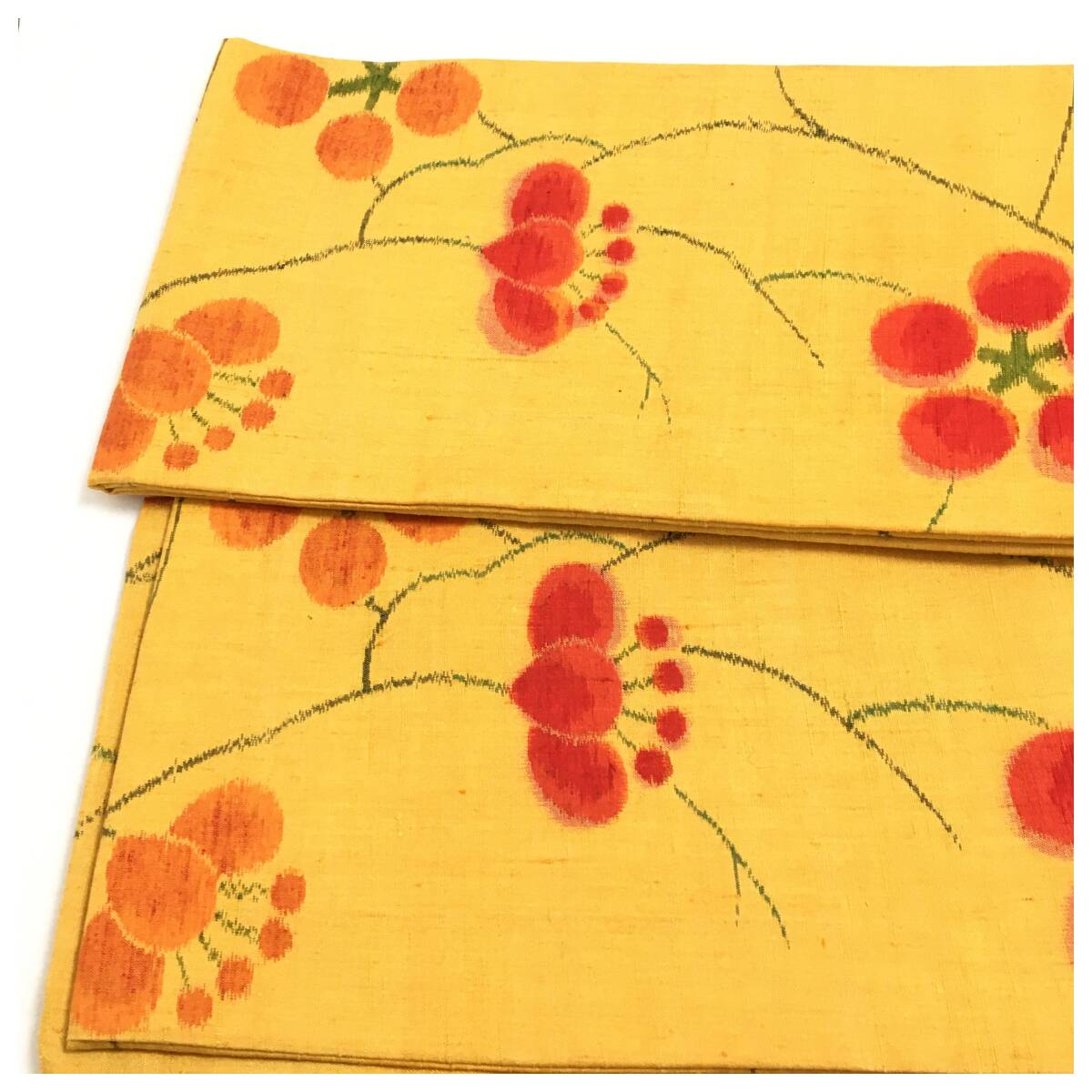 鮮やかなマスタードイエローの正絹地に、赤とオレンジの梅鉢(うめばち)文様が大胆に配された創作半幅帯です。梅は天神様(菅原道真)のシンボルでもあり、学問成就や誠実さを象徴する縁起の良い文様。どこかレトロでモダンな雰囲気を感じさせるデザインが、装いの主役として美しく映えます。