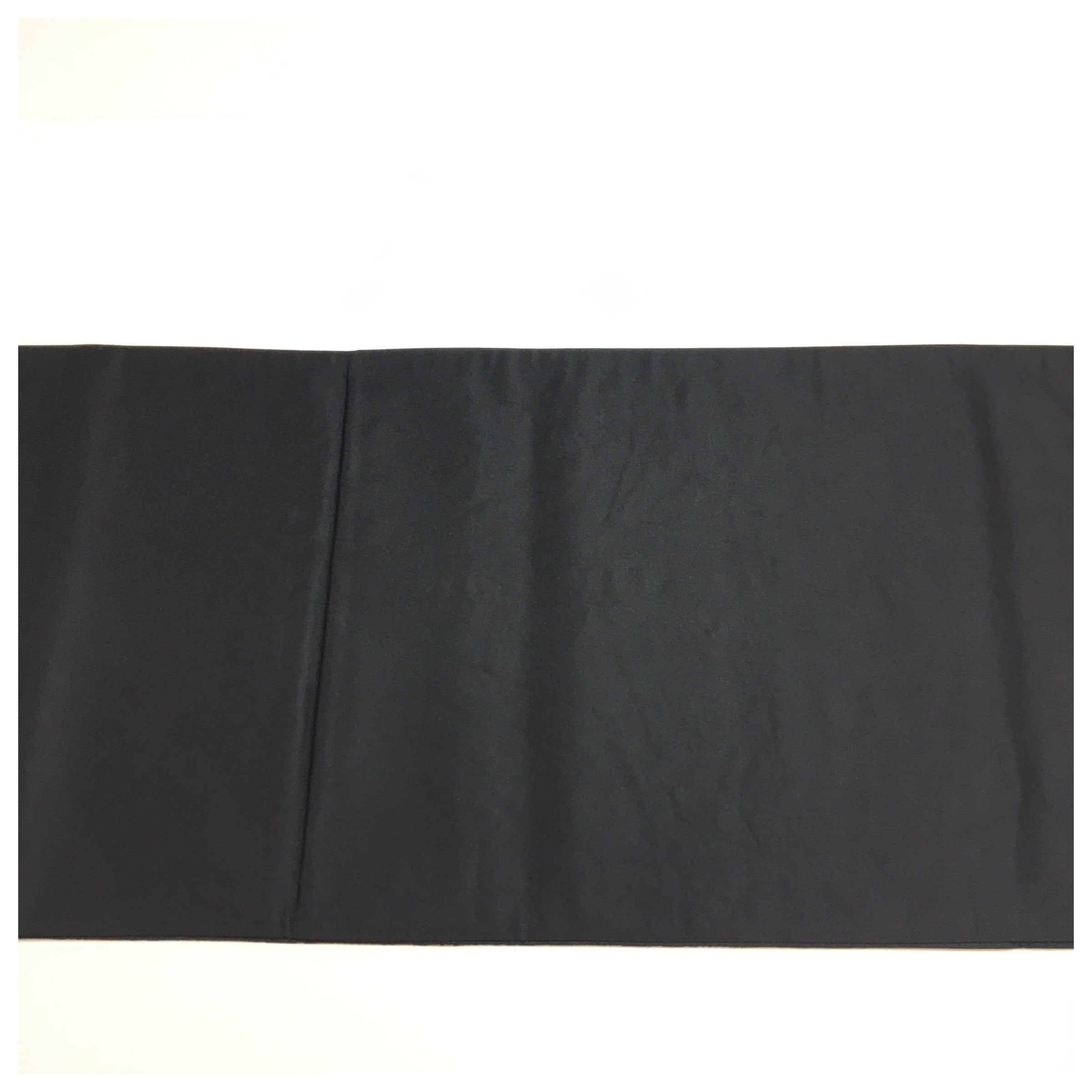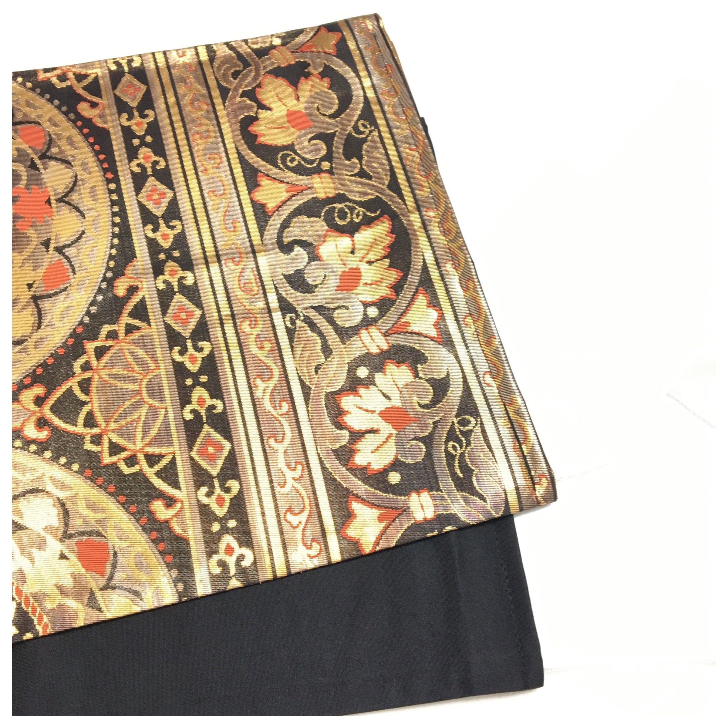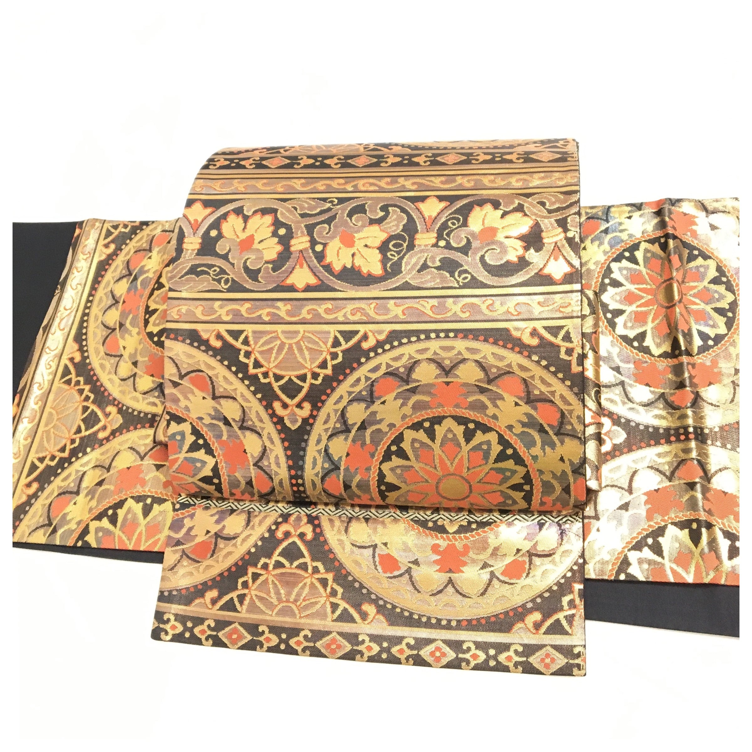 黒地に金糸が織り込まれた、薄手ですが存在感あふれる正絹の二部式作り帯です。伝統的な「華紋(かもん)」と、優美な曲線を描く「唐草文様」が美しく配置された格調高い雰囲気を醸し出しています。