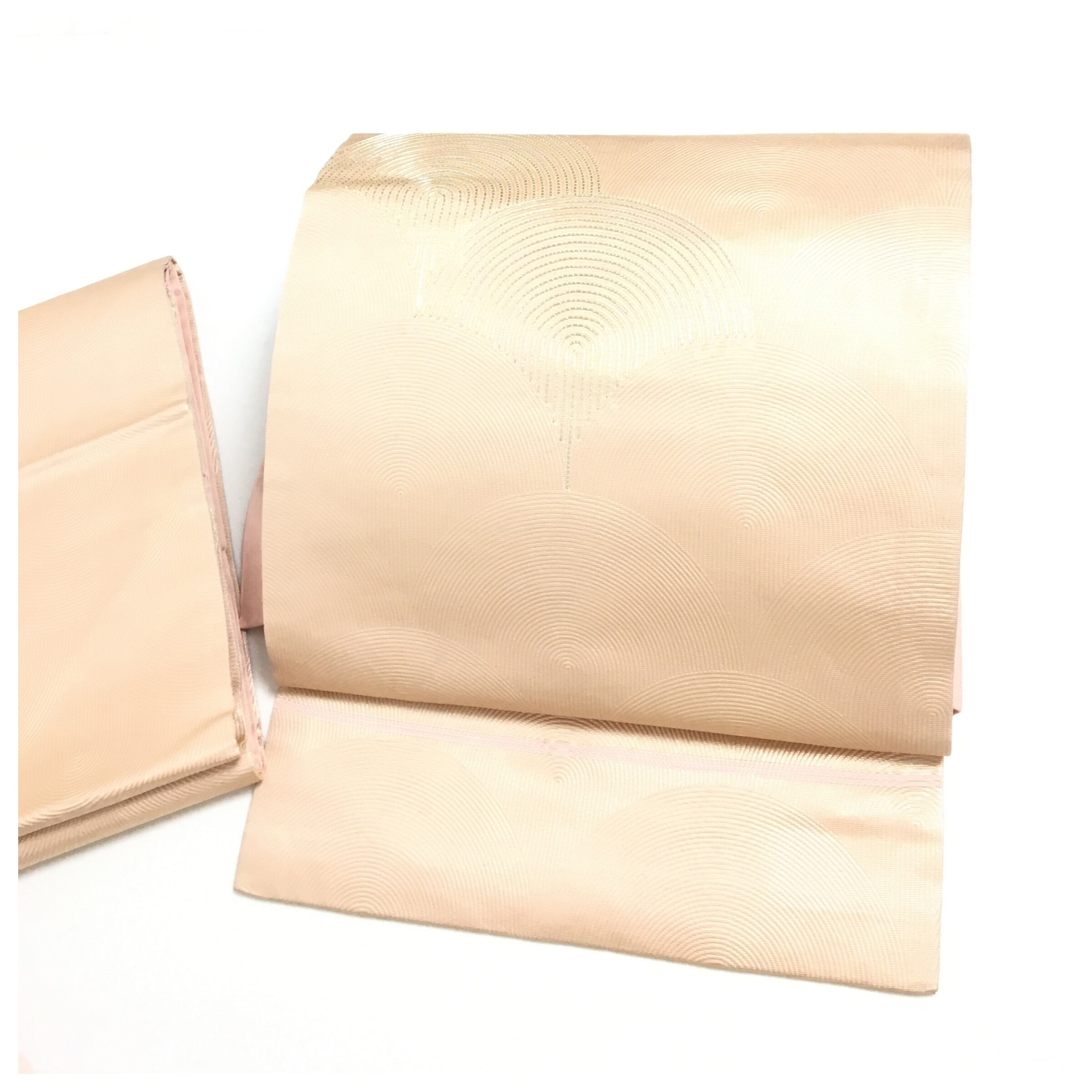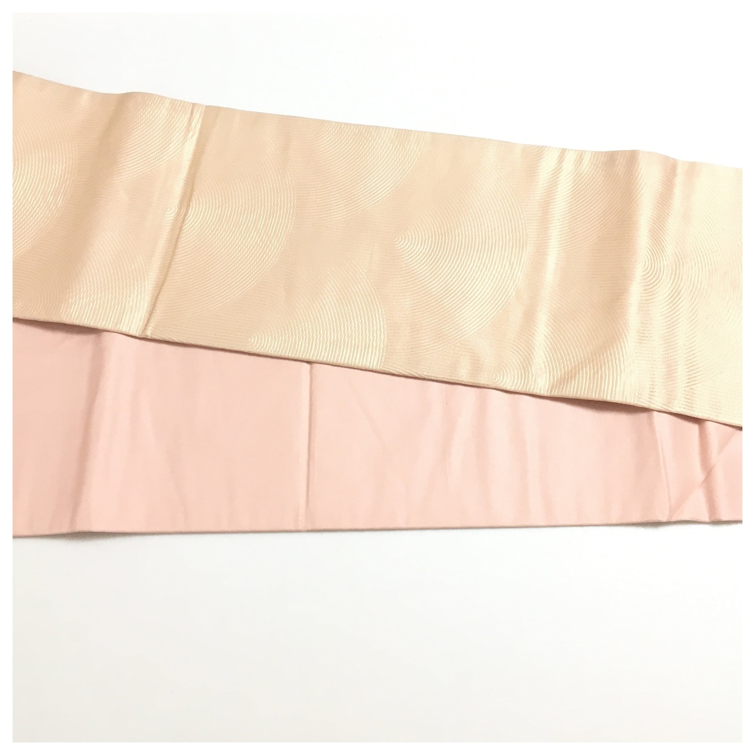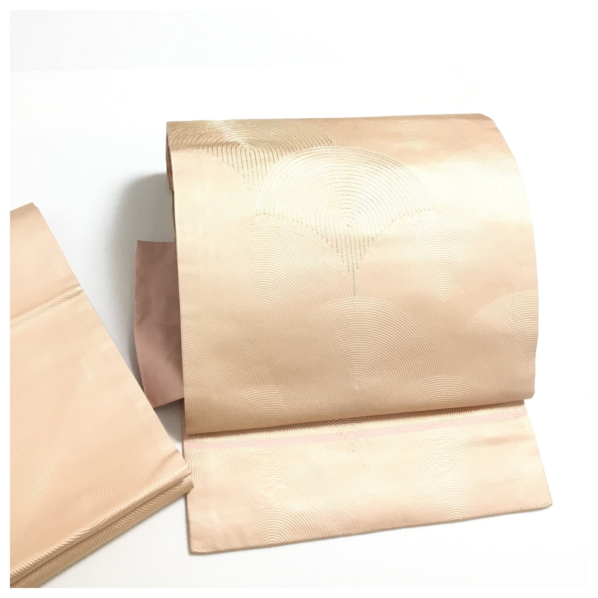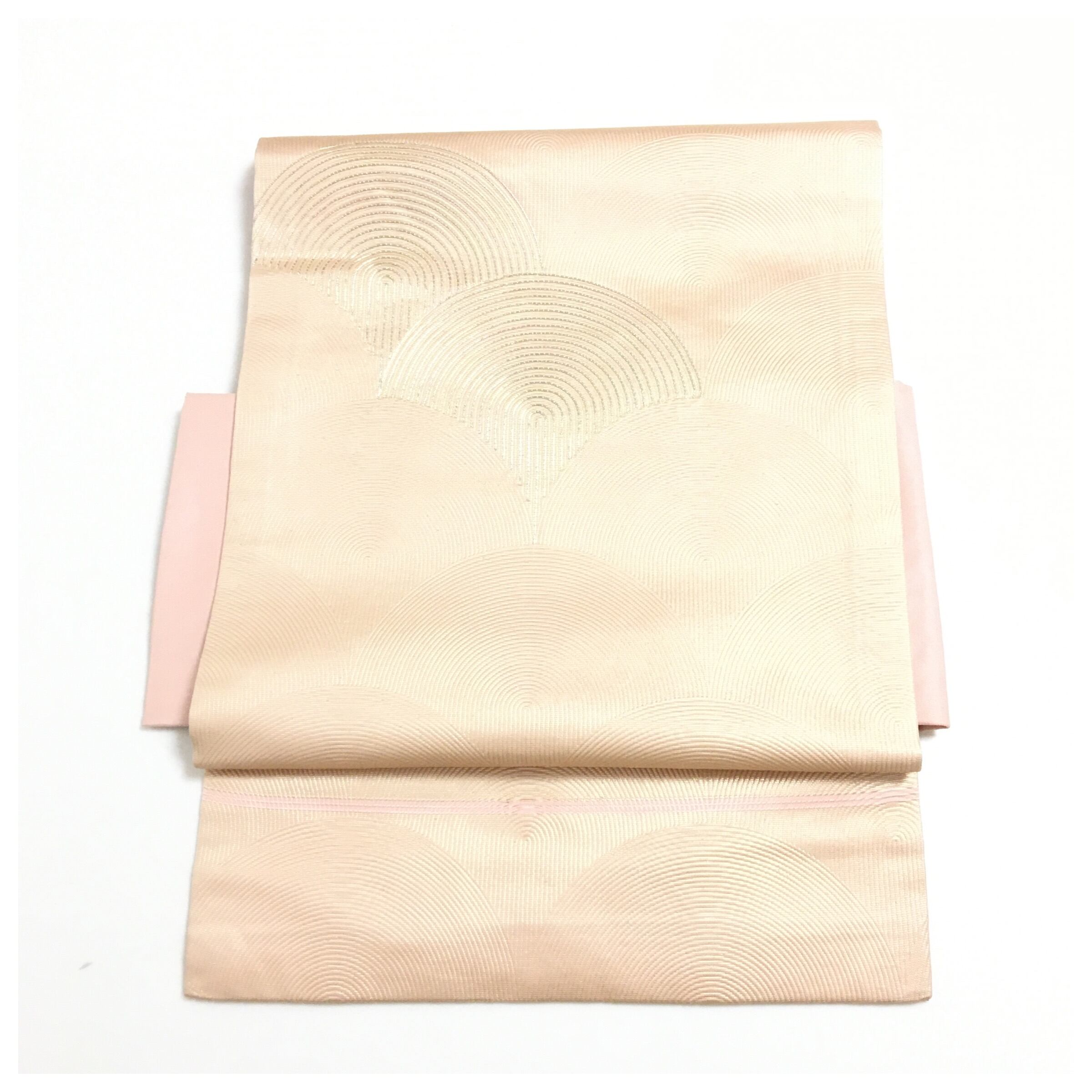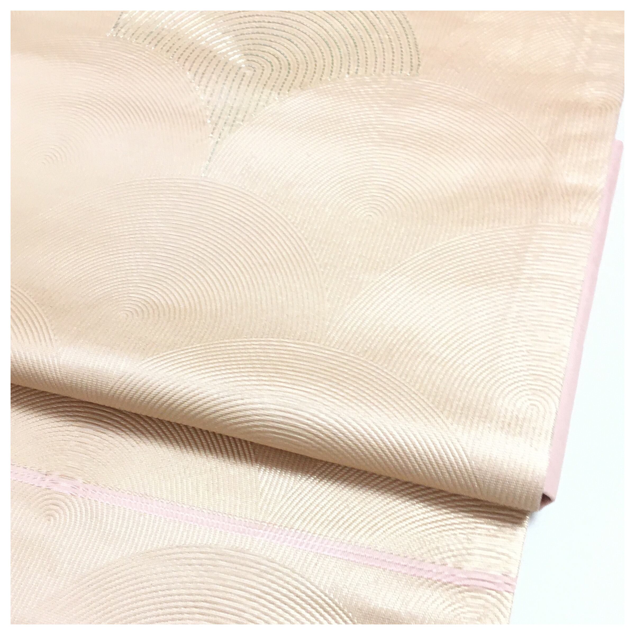 落ち着いたピンク色の地に、銀糸で菱取りや抽象的な曲線が織り出された、モダンな雰囲気の正絹名古屋帯(二部式作り帯)です。