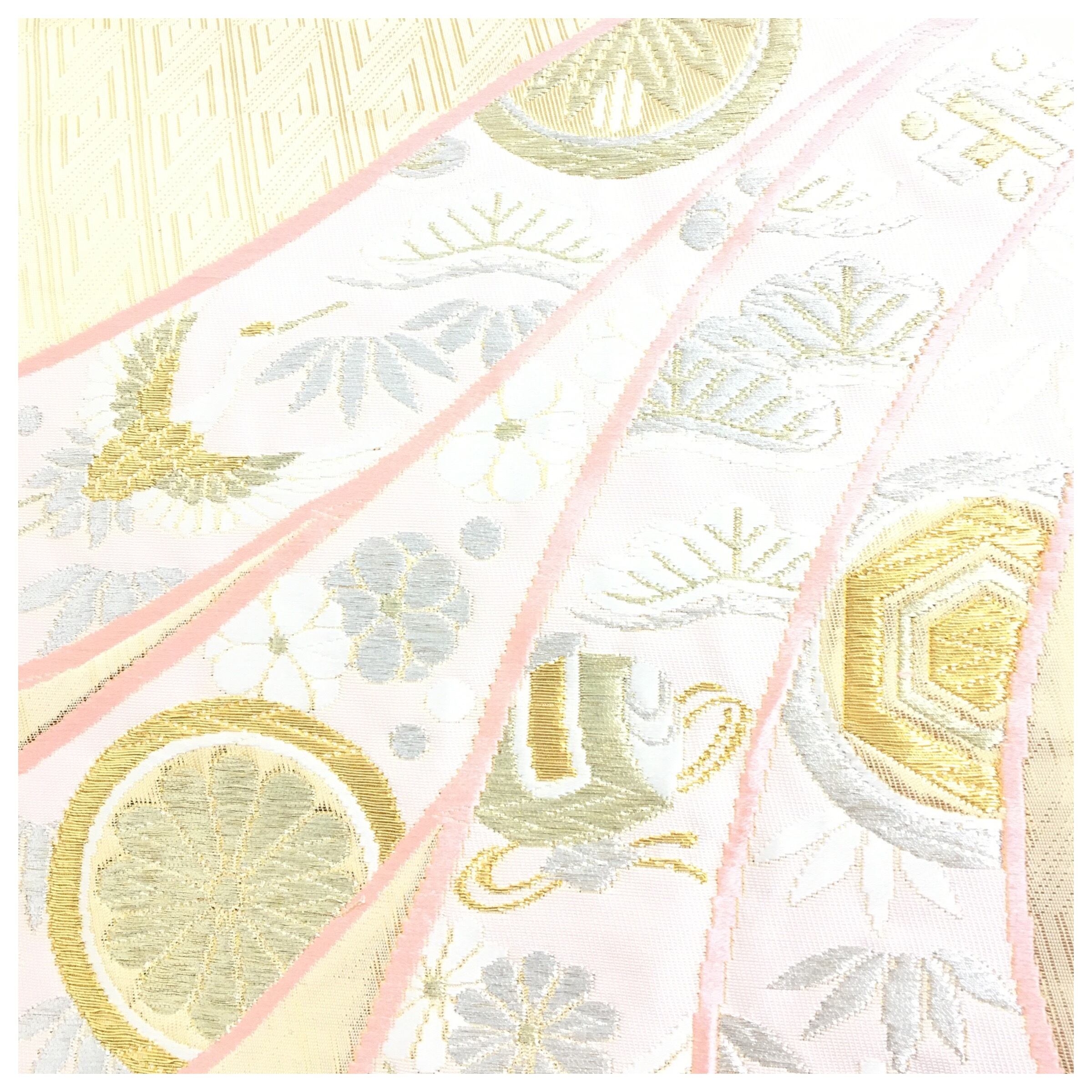 意匠には、おめでたい「熨斗(のし)」の文言通り、長く伸びゆく熨斗目に沿って、松竹梅や菊、そして優雅に羽ばたく鶴など、格調高い四季の吉祥文様が細やかに織り描き出されています。