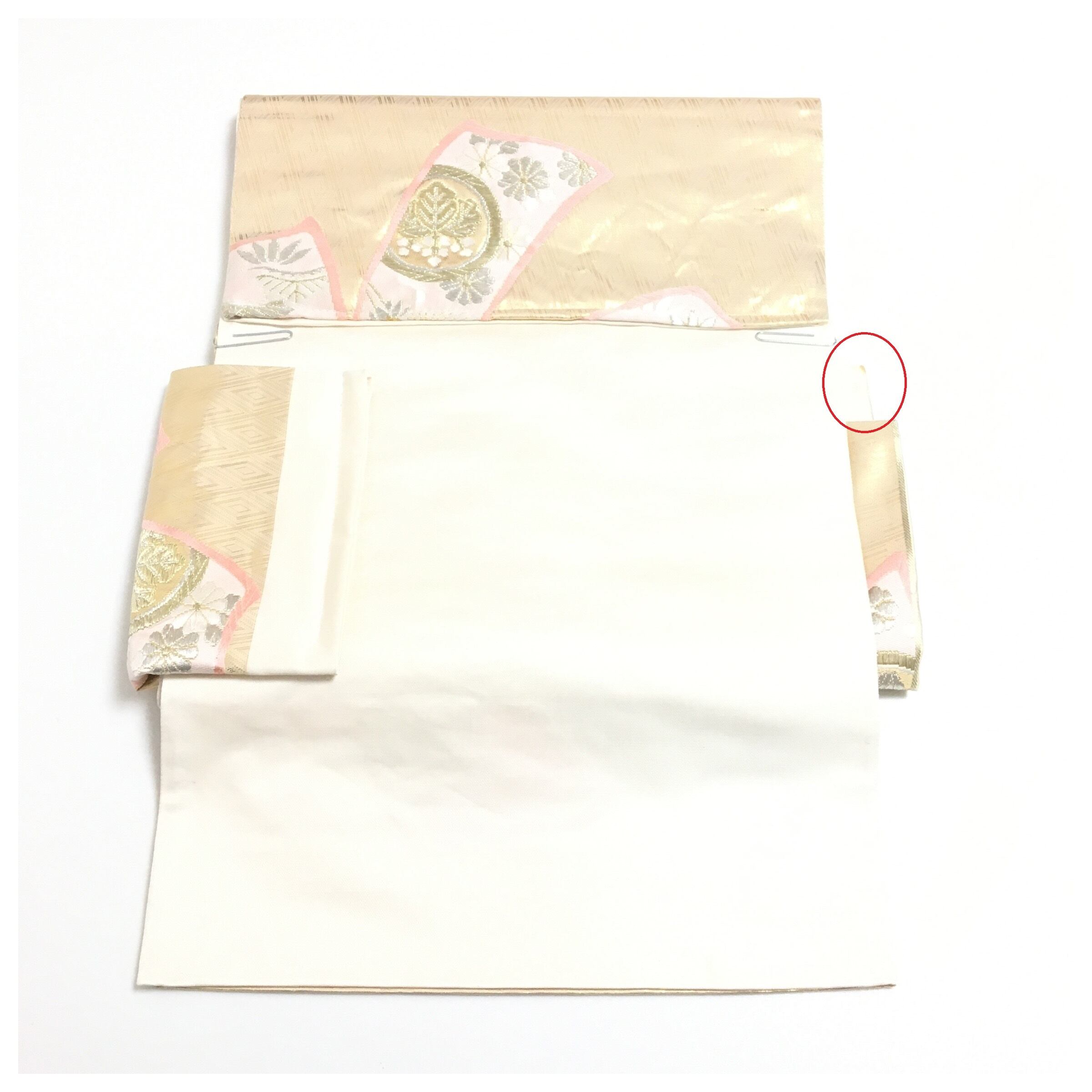 お太鼓の手先(裏側にあたる部分)に濃いめの汚れがございます。着用時、後ろから見えてしまいます。 着用は個人差と致しますのでご理解のある方へお求めやすくお譲りします。