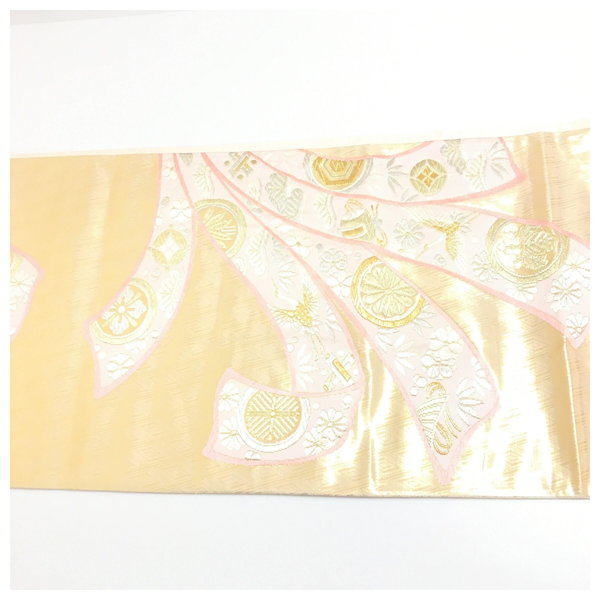 上品な輝きを放つ純金箔を贅沢に使用した、正絹の二部式作り帯でございます。