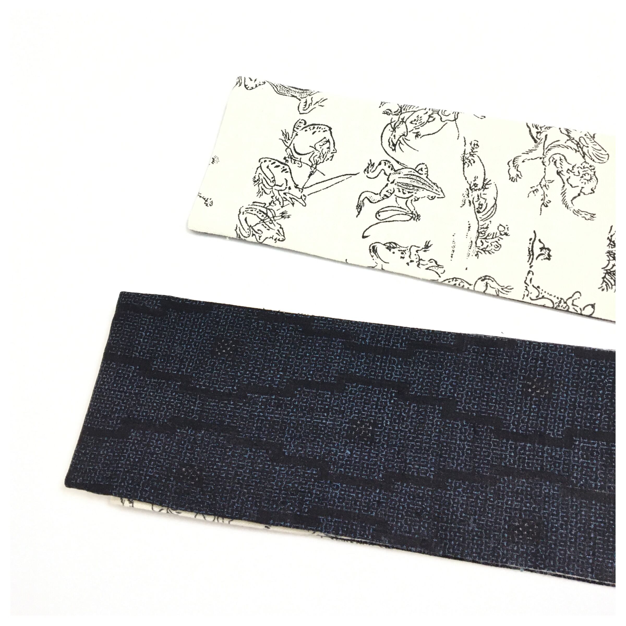 日本最古の漫画とも称される「鳥獣戯画」をモチーフにした、遊び心たっぷりの男物角帯でございます。