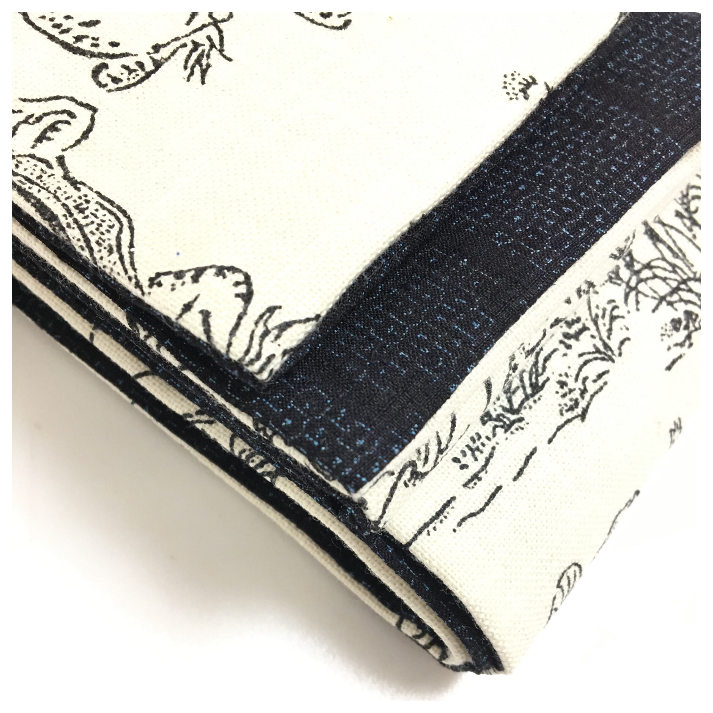 生成り地に墨色で描かれたカエルや猿たちが、今にも動き出しそうな躍動感を持って織り出されています。裏面は落ち着いた紺色の紬地となっており、その日の気分や装いに合わせて使い分けができるリバーシブル仕様です。