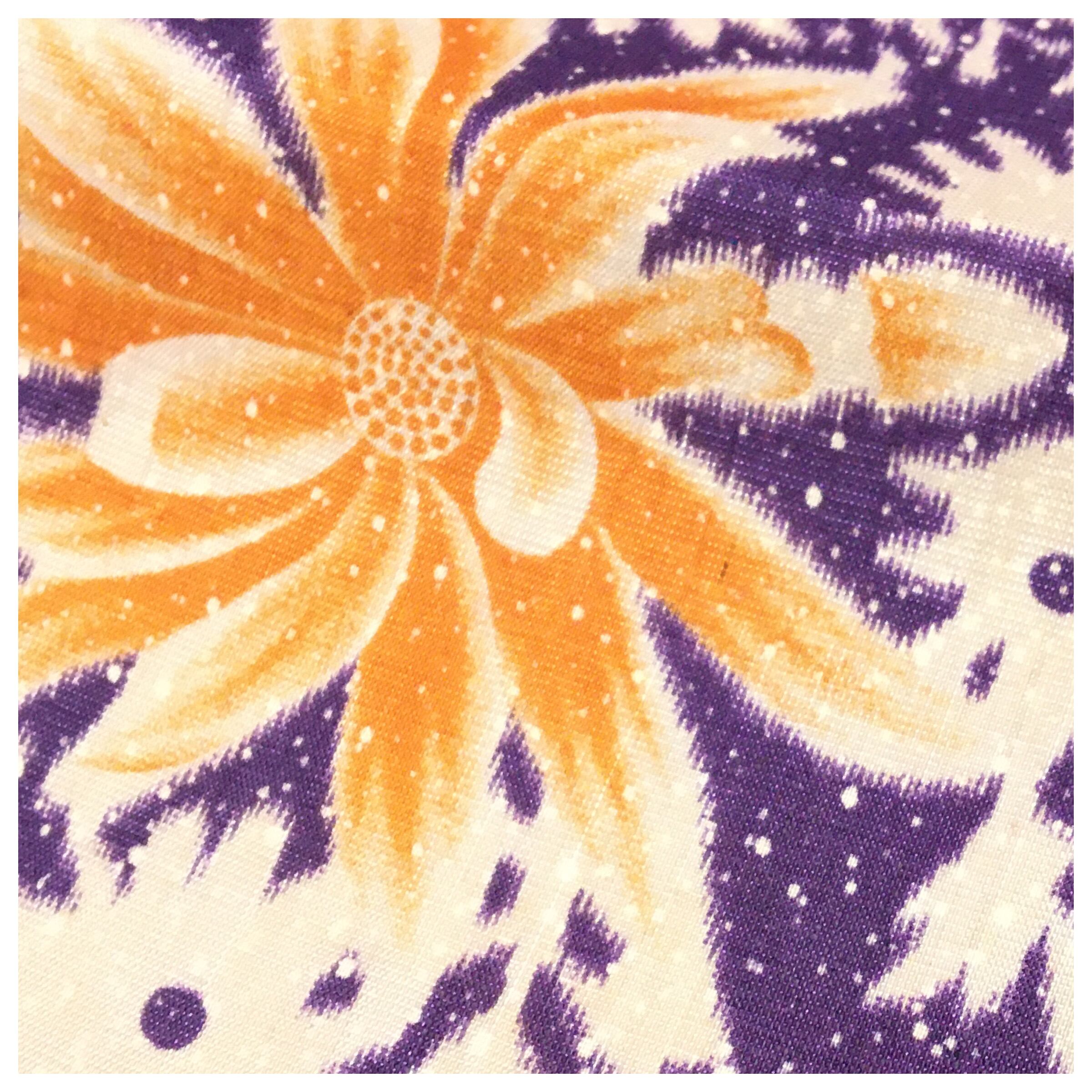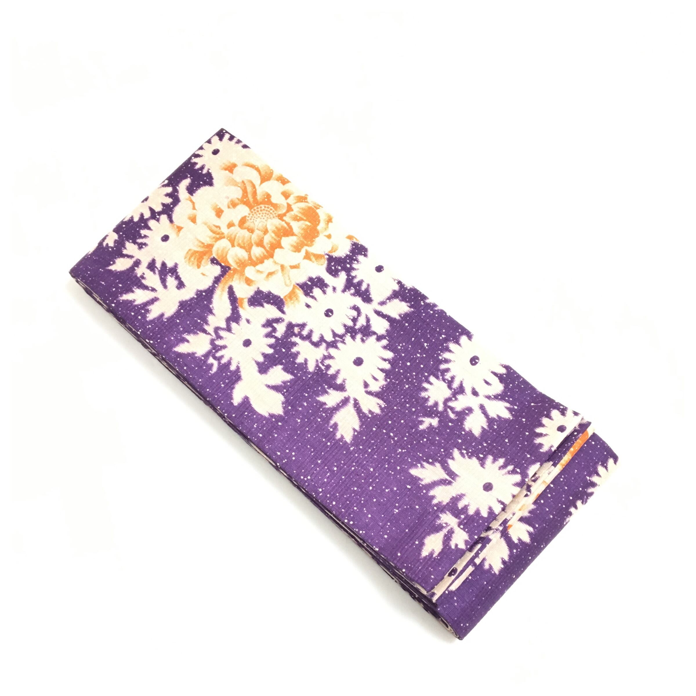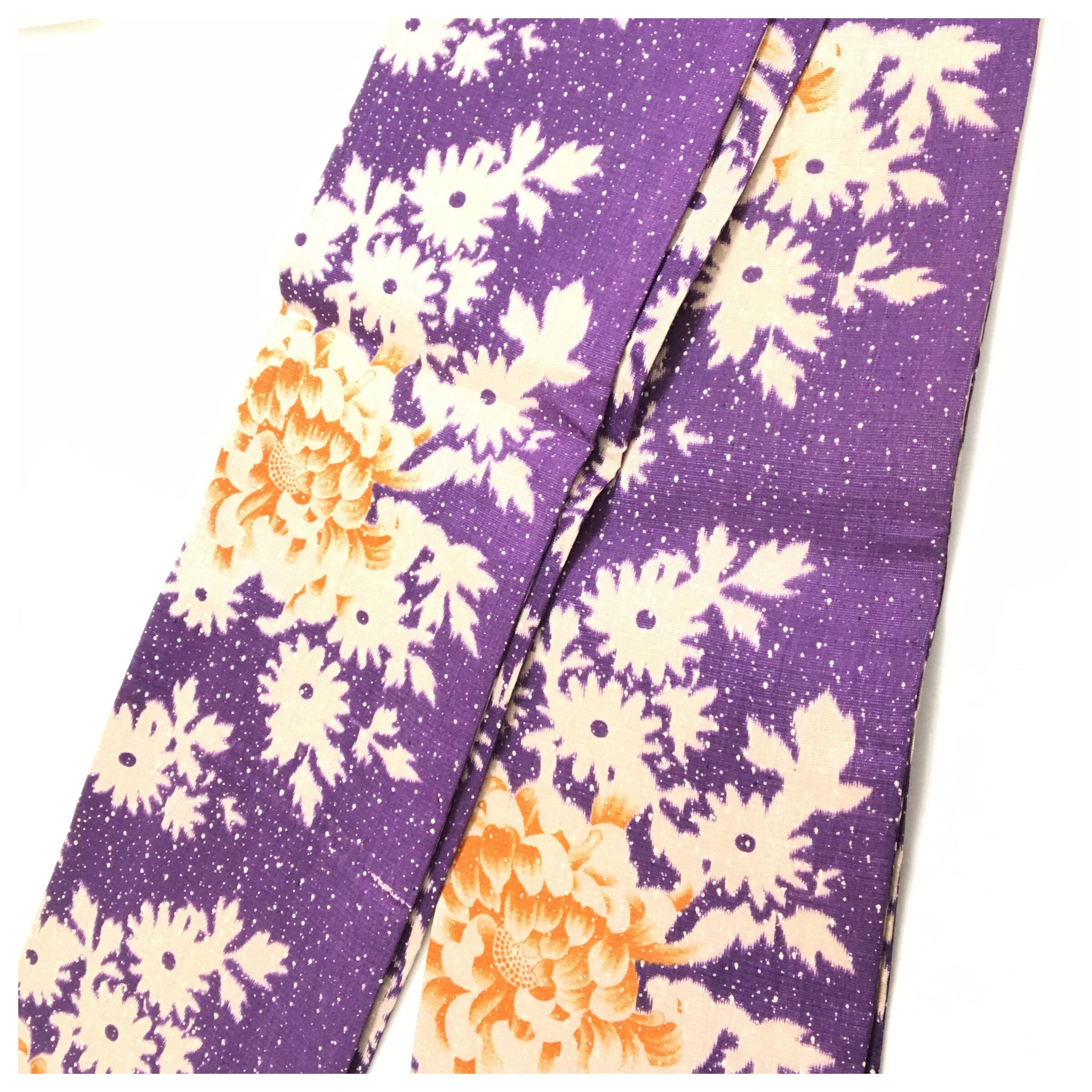 アンティークならではの深い紫地に、橙色の菊花が鮮やかに映える正絹の半幅帯でございます。