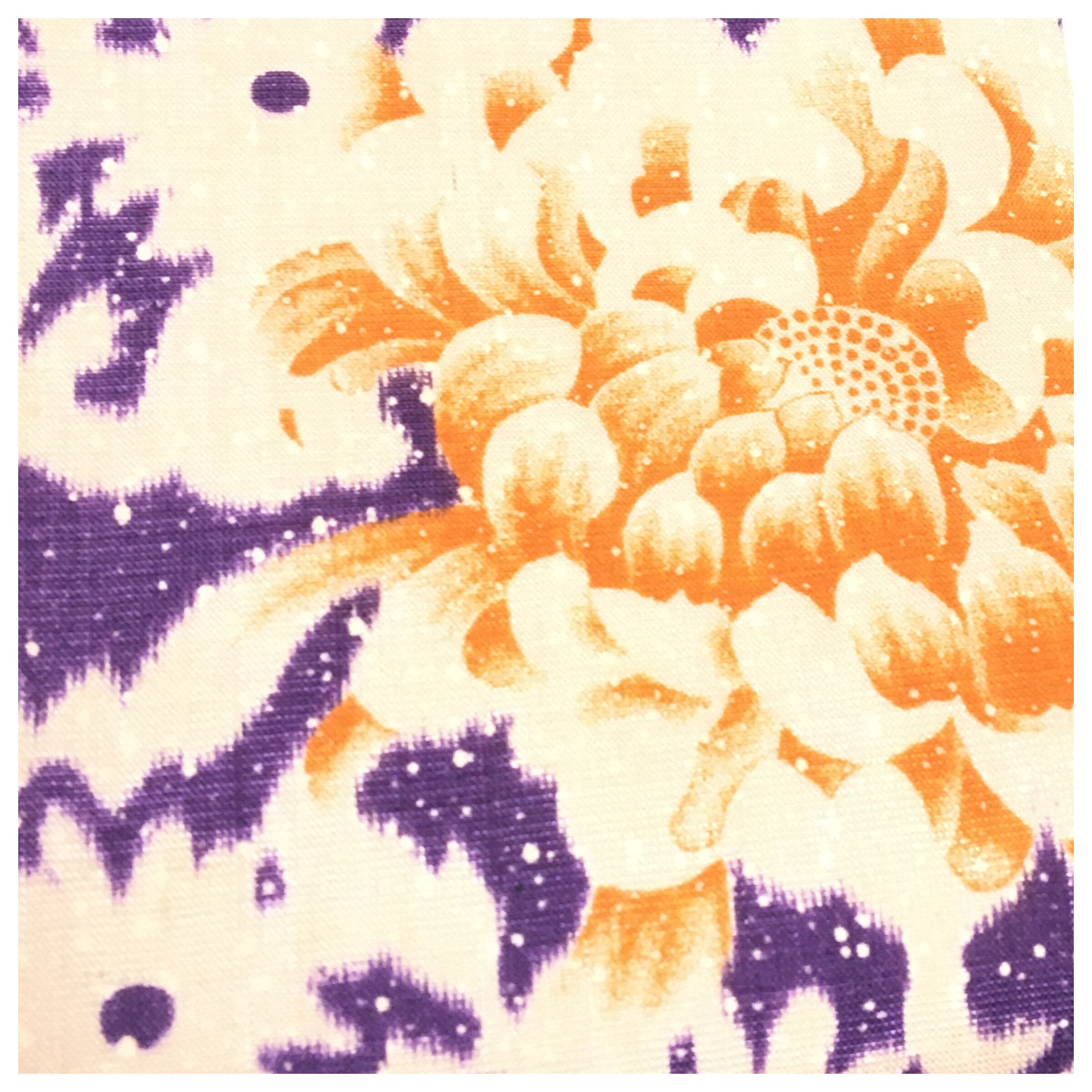 意匠には、力強く咲き誇る大輪の菊が、あられのような白い点描とともに幻想的に描かれています。大胆な柄行ながらも、どこか懐かしく温かみのあるレトロな雰囲気が漂います。