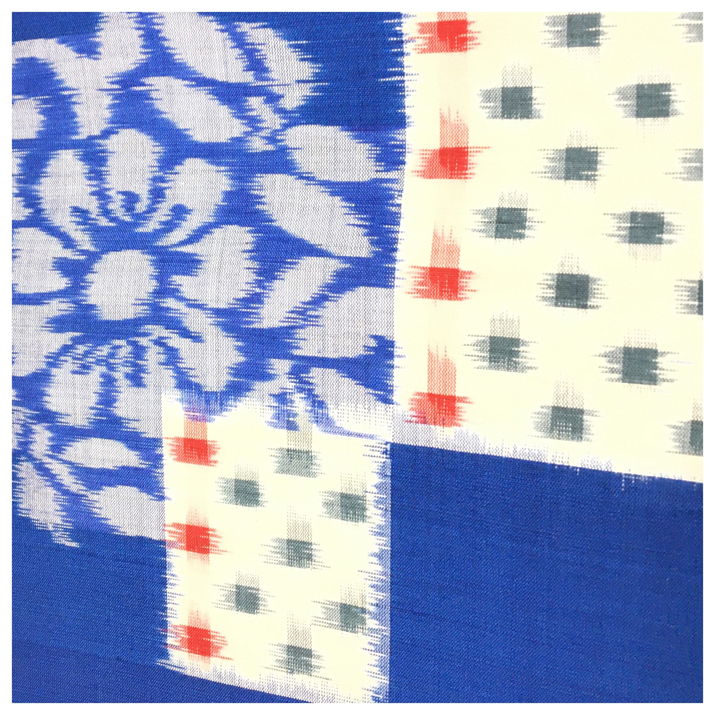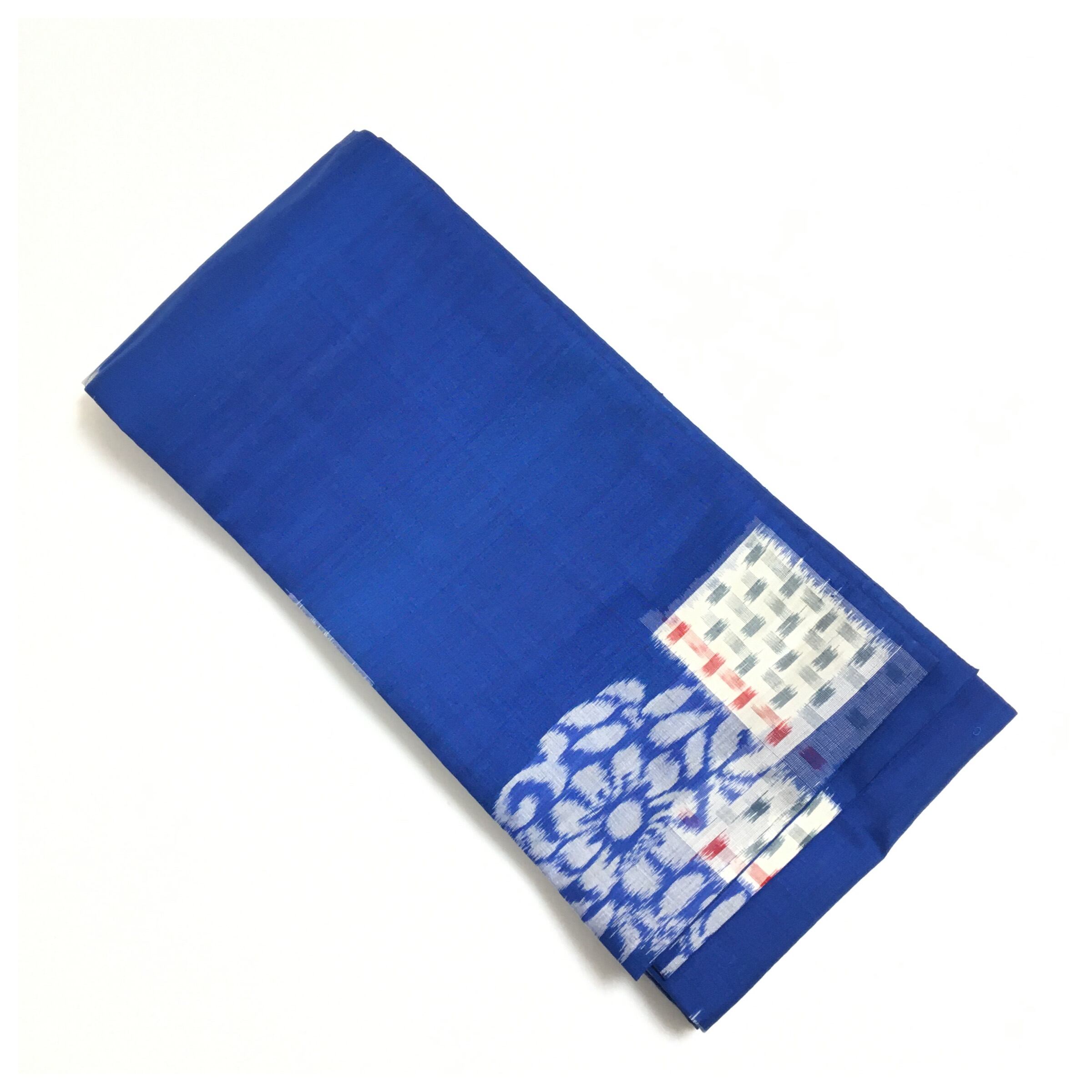 銘仙ならではの、あえて輪郭をぼかしたような柔らかな絣(かすり)模様が、ロイヤルブルーの地に白と赤でリズミカルに描かれています。この独特の発色と大胆な図案は、アンティーク銘仙ならではの魅力です。