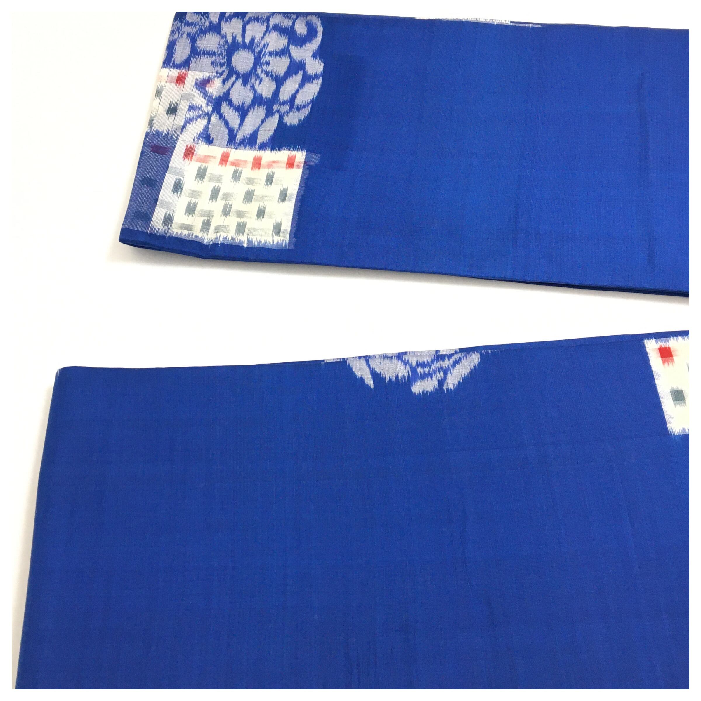 正絹 半幅帯 銘仙 アンティーク 青 絣 鮮やかな青に大正ロマンの風 絣模様がモダンに躍る