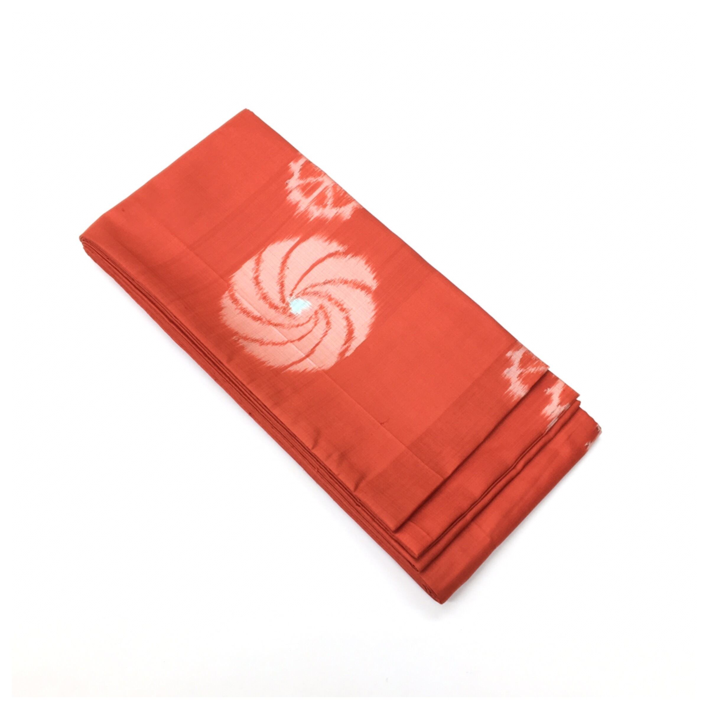 正絹 半幅帯 個性派 アンティーク 銘仙 赤 全通 長尺420 幅16 中古品 です。